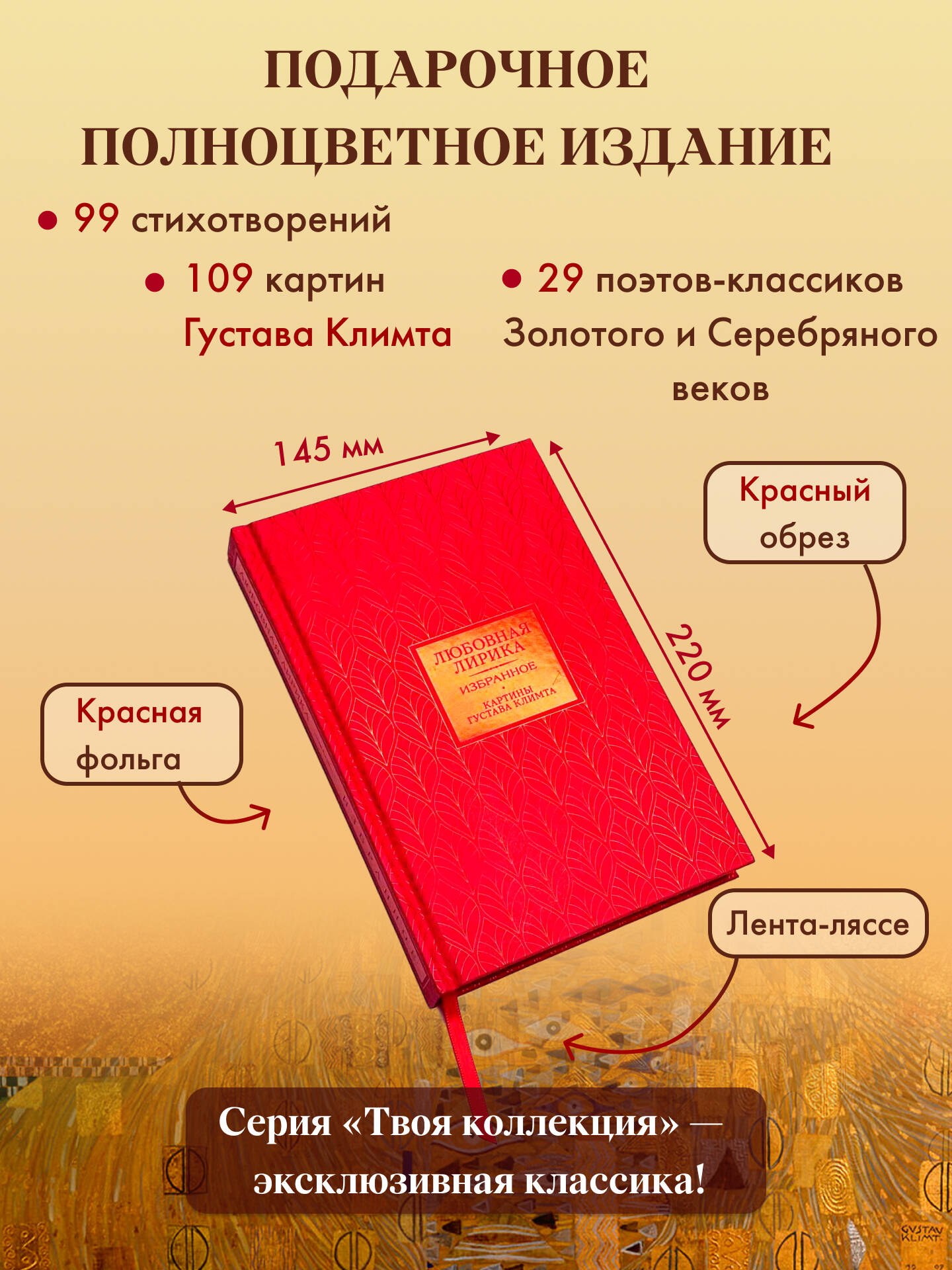 В коллекционном полноцветном издании "Любовная лирика. Избранное" представлены известные стихотворения великих русских поэтов Золотого и Серебряного веков о знакомом каждому читателю калейдоскопе чувств - от нежности до страсти, от печали и тоски до страданий из-за отсутствия взаимности. В качестве иллюстраций к произведениям использованы картины гениального австрийского художника-модерниста Густава Климта (1862-1918), эстетично дополняющие лирику, придавая ей визуальную глубину и подчёркивая чувственность и красоту любовных переживаний.| Издательство | Издательство "АСТ" |