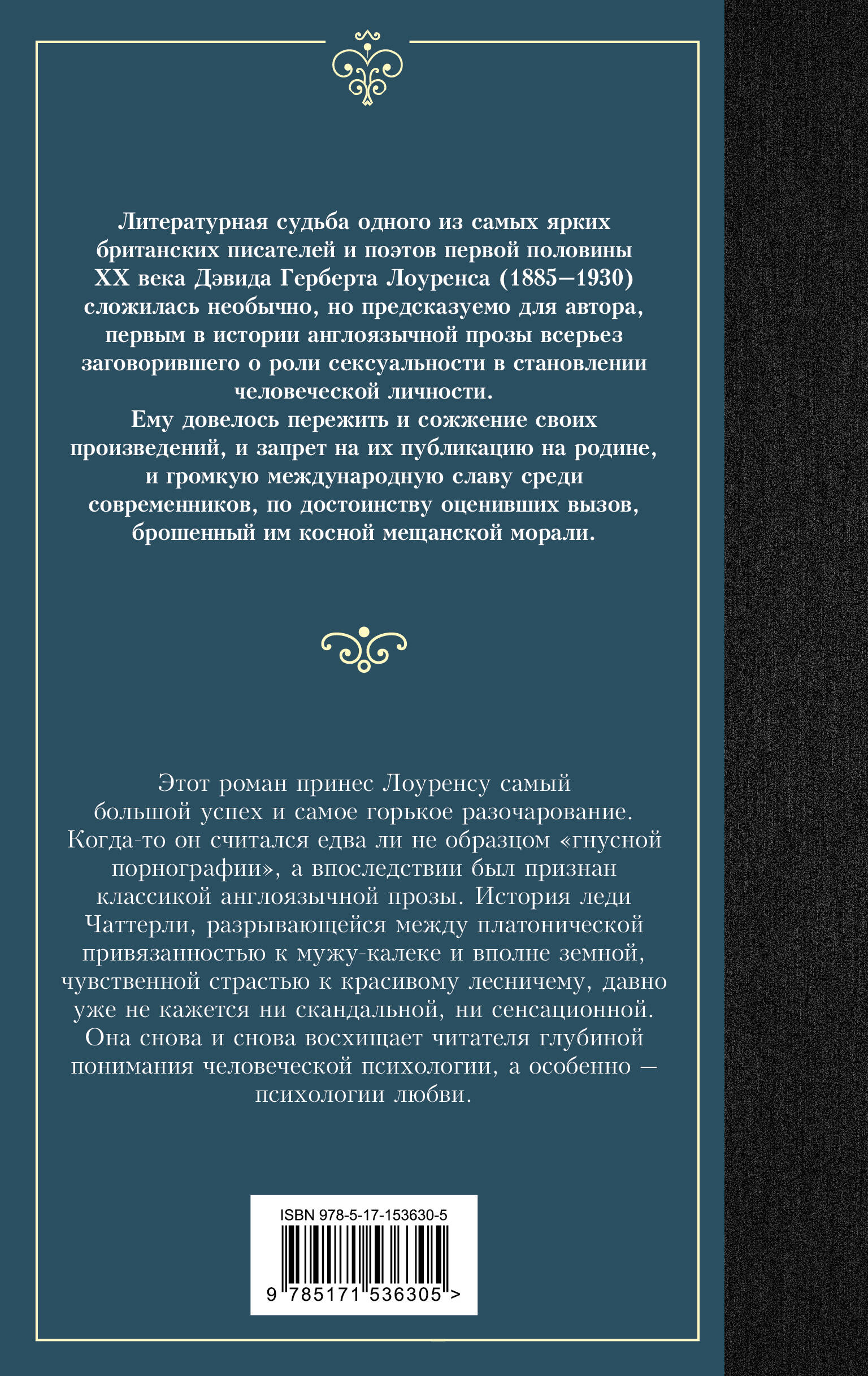 Роман, считавшийся порнографией в ХХ веке, в наши дни стал признанной классикой мировой литературы. В одной только Великобритании после многолетнего запрета за первый год продали более 3 000 000 экземпляров. «Любовник леди Чаттерли» - один из самых часто экранизируемых романов, последняя адаптация вышла в декабре 2022 года, главную роль сыграла звезда «Короны» Эмма Коррин.| Издательство | ИЗДАТЕЛЬСТВО "АСТ" |