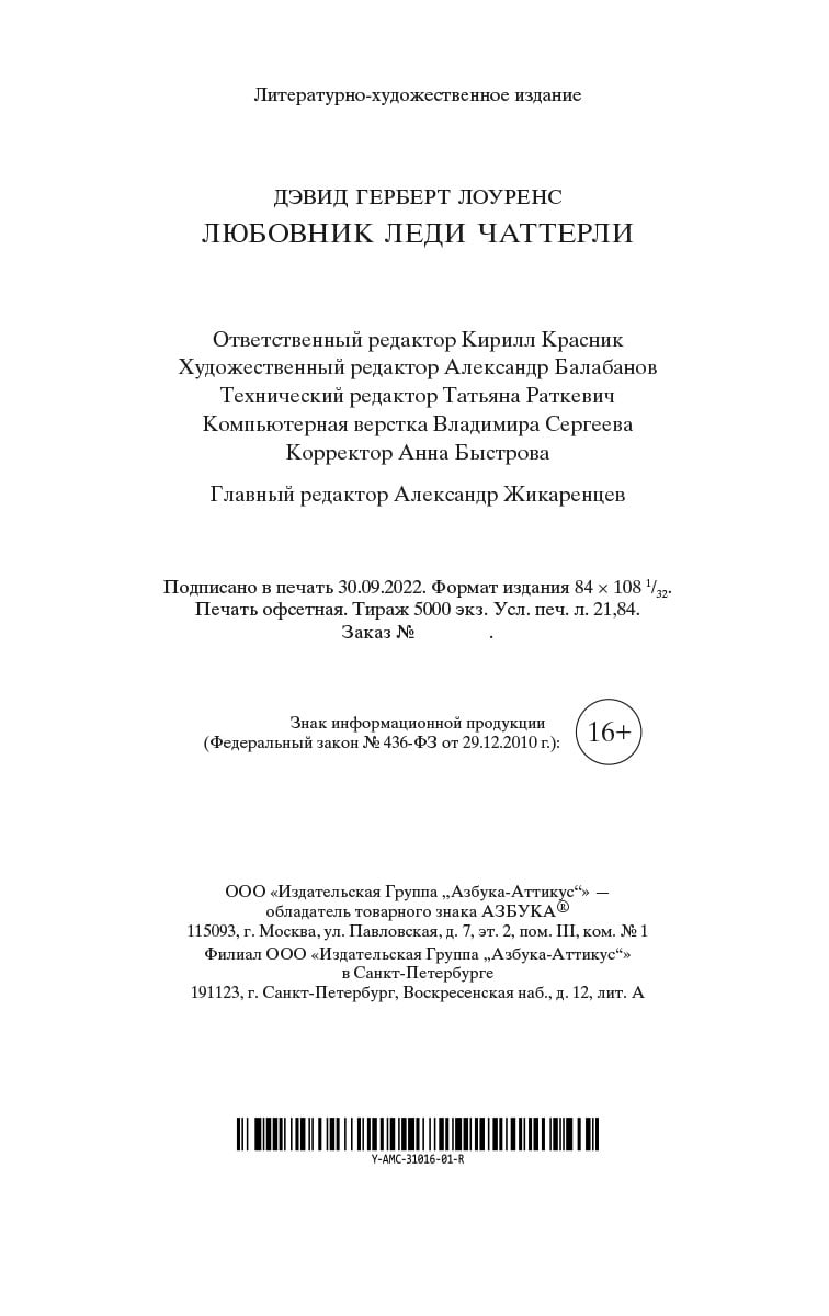 Дэвид Герберт Лоуренс остается одним из важных писателей у себя на родине, в Англии, да и, пожалуй, во всей Европе. Основную часть его обширного наследия составляют романы. Лучшие из них - «Любовник леди Чаттерли», «Женщины в любви», «Сыновья и любовники» - стали классикой англоязычной литературы ХХ века. Однако именно «Любовник леди Чаттерли» принес Лоуренсу самый большой успех и самое горькое разочарование. Накал страстей и яркость любовных сцен были восприняты как вызов обществу. Сразу после выхода в свет в 1928 году он был запрещен, а готовый тираж изъят и уничтожен. Лишь в 1960 году, после громкого судебного процесса, всколыхнувшего всю Англию, роман был реабилитирован и по сей день остается одним из самых любимых и читаемых.| Издательство | Азбука |