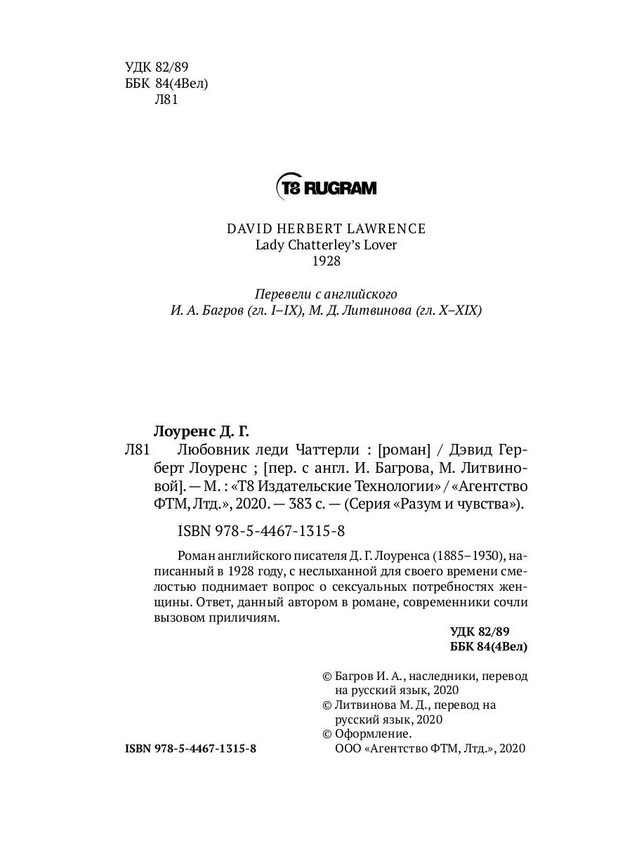 Роман английского писателя Д. Г. Лоуренса (1885-1930), написанный в 1928 году, с неслыханной для своего времени смелостью поднимает вопрос о сексуальных потребностях женщины. Ответ, данный автором в романе, современники сочли вызовом приличиям.| Издательство | Т8 RUGRAM |