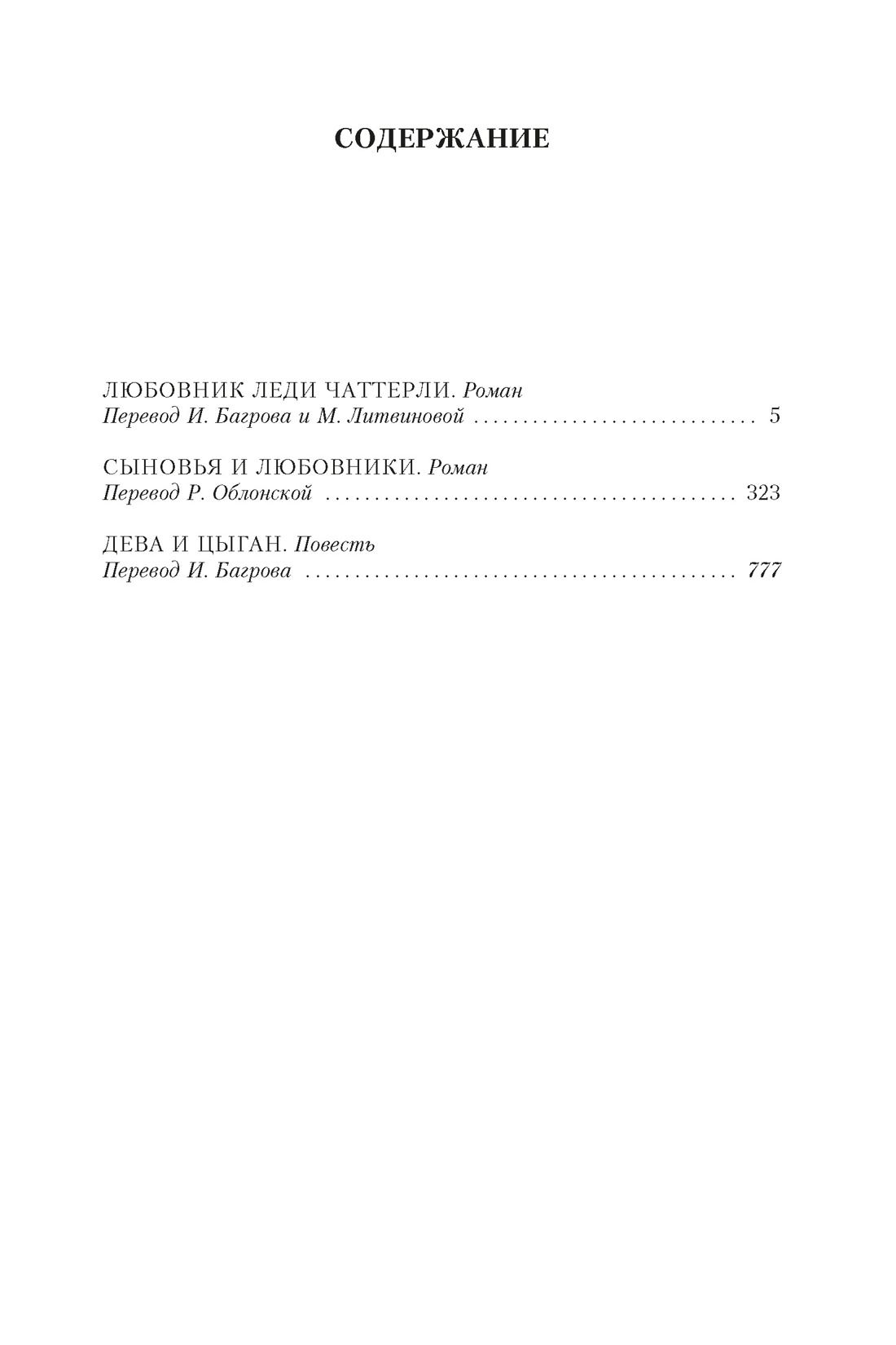 О книгах Дэвида Герберта Лоуренса много спорили и при его жизни, и в последующие годы. Лоуренсом, чье имя стоит в одном ряду с именами Джеймса Джойса, Томаса Стернза Элиота и Вирджинии Вулф, восхищались и возмущались, его превозносили и ниспровергали, его романами зачитывались и объявляли их непристойными. Но всегда очевидным оставалось одно: Лоуренс, автор романов «Радуга», «Влюбленные женщины», «Любовник леди Чаттерли» и других, - один из крупнейших английских писателей XX века. В настоящее издание вошли два лучших романа писателя - «Сыновья и любовники» и «Любовник леди Чаттерли», а также повесть «Дева и цыган».| Издательство | Иностранка |
