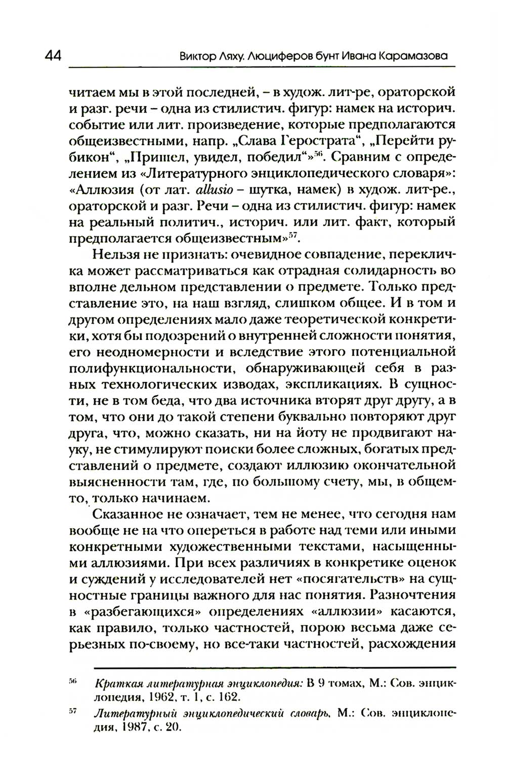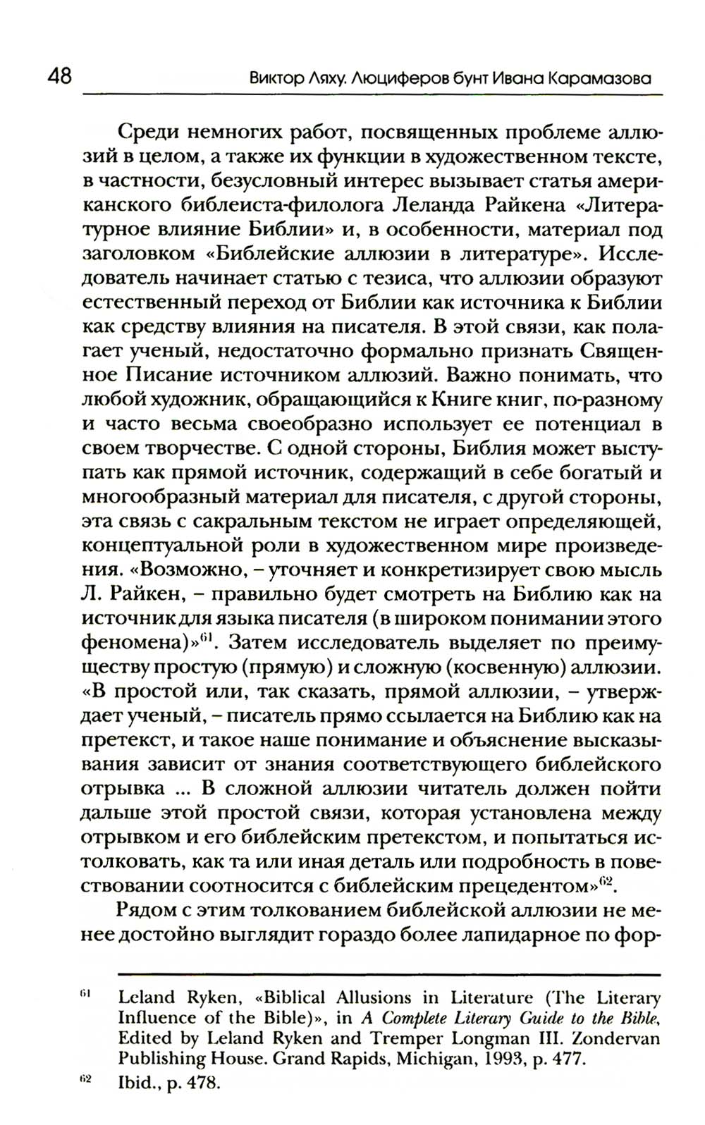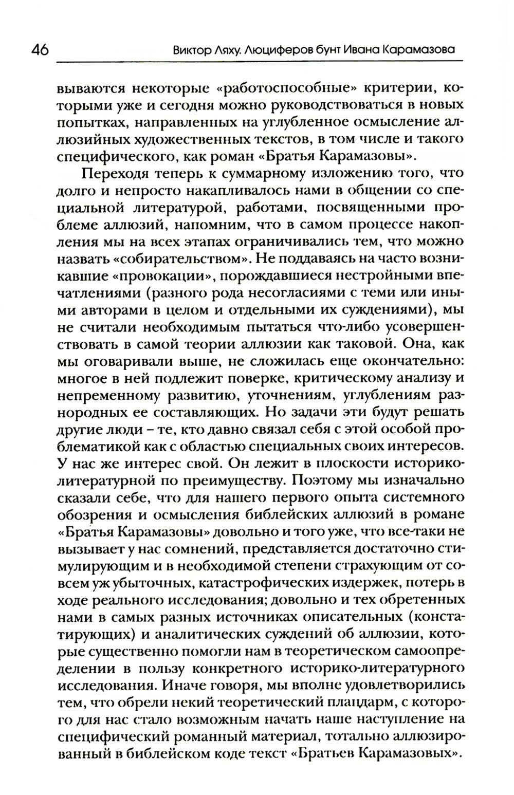 В мировой науке давно уже сложилась и стала общепризнанной традиция соотносить образ Ивана Карамазова с целым рядом масштабных, метафизически-знаковых персонажей мировой литературы. Но в «поэтике памяти» Достоевского особое место занимал художественно-образный мир Библии, который становится для него в творческом плане определяющим интертекстом, «великим напоминанием». В книге Виктора Ляху образ Ивана осмысляется как аллюзия на «первоангела Денницу». Библейский сюжет о Люцифере, восставшем против Творца, стал, по мысли автора книги, для русского художника парадигмой, которая была им востребована в логике собственной интертекстуалыюй стратегии. С оглядкой на смыслы библейского прототекста Достоевский художественно воплотил в «Братьях Карамазовых» фундаментальную идею своей эпохи, идею бунтующего своеволия. Кульминацией этой борьбы стало, в конце концов, как писал сам художник, «столкновение двух самых противоположных идей, которые только и могли существовать на земле: человекобог встретил Богочеловека».