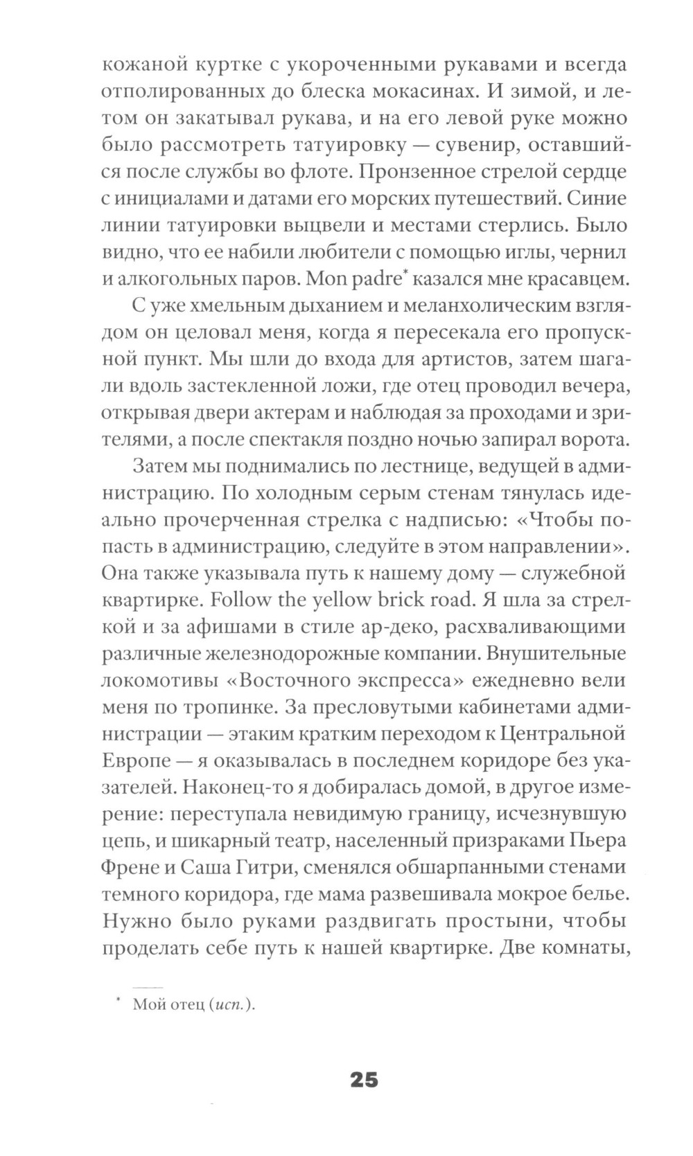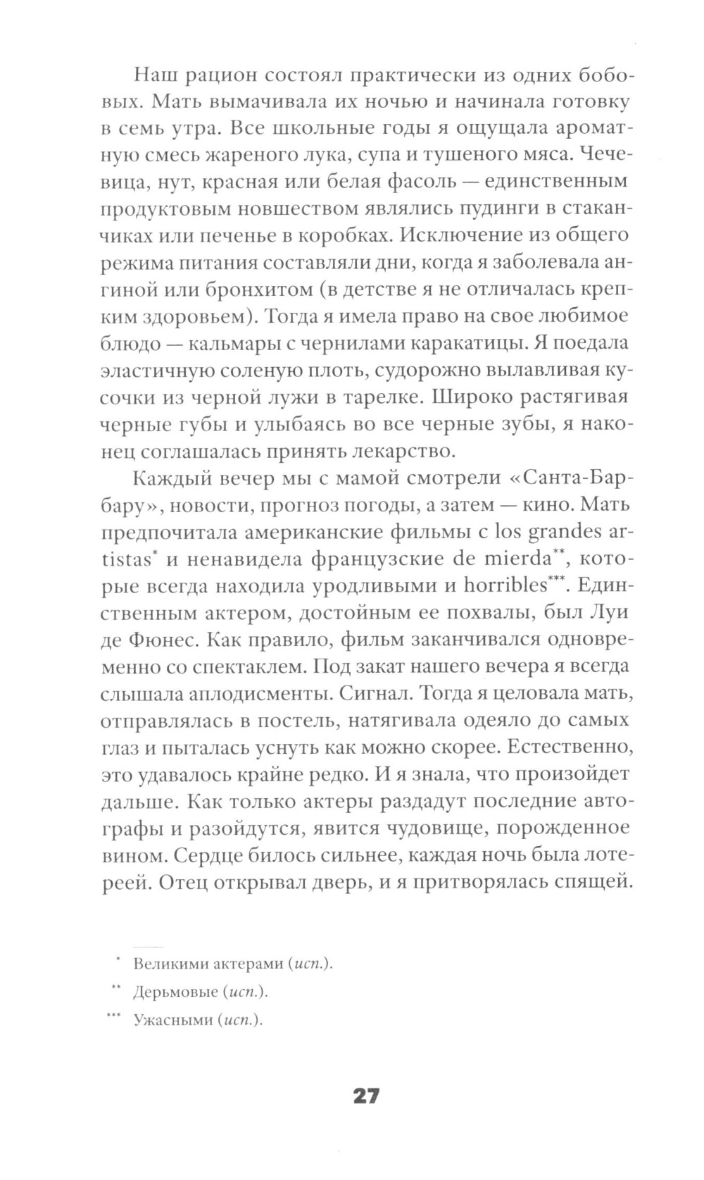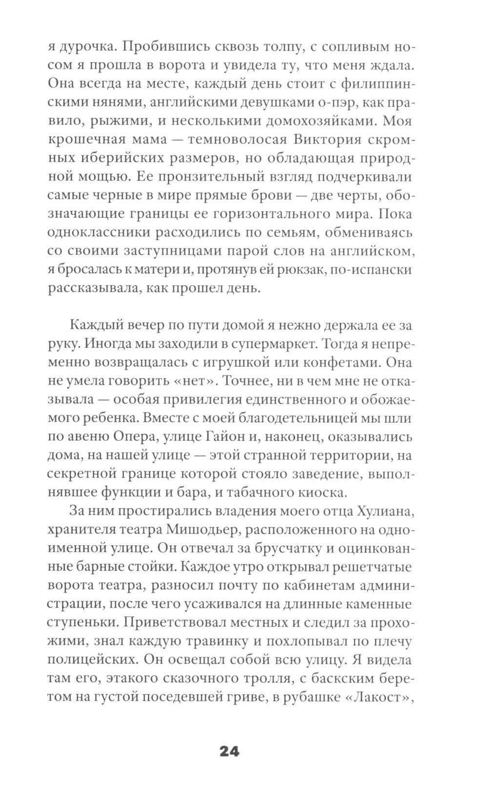 Детство Марии, дочери эмигрантов из Бильбао, прошло за кулисами парижского театра Мишодьер, среди актеров, костюмов и декораций: ее отец Хулиан - баск с взрывным характером, коллекцией оружия и пристрастием к алкоголю - работает здесь хранителем, а мать Виктория - некогда неотразимая галисийка, встречающая вспышки ярости мужа покорным молчанием, - уборщицей. Взрослея, Мария отдаляется от семьи, учится на кинорежиссера, влюбляется, делает карьеру - в общем, живет своей жизнью. Пока случайно не узнает, что эта жизнь построена на лжи, а у Виктории и Хулиана есть один большой секрет. В поисках правды Мария возвращается в Страну Басков, погружается в запутанные коррупционные схемы постфранкистского периода, полностью переосмысляет отношения с родителями и решает рассказать свою историю необычным для кинематографиста способом - написав роман, в котором ловкие монтажные склейки будут переносить читателя из рыбацкой деревни в Галисии в злачные районы Бильбао; из иезуитского приюта для бедняков в богемные бары Парижа; с театральной сцены, где разыгрывают бульварные комедии, на арену кровавой корриды. Дебютный роман Марии Ларреа, основанный на истории ее семьи, был удостоен ряда французских и испанских литературных премий, в том числе Prix du Premier Roman и Prix Roman France Televisions. По книге был поставлен моноспекталь с Беренис Бежо.| Издательство | Подписные издания |
