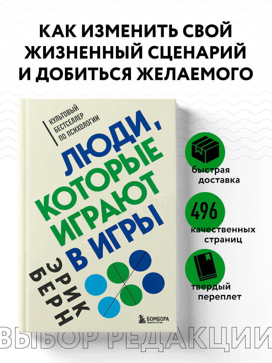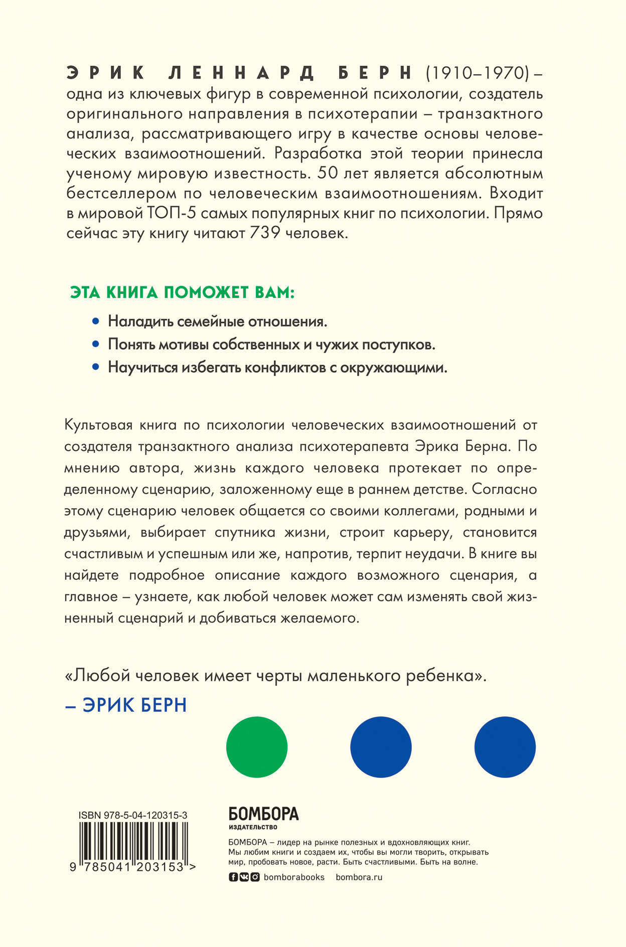 Эрик Леннард Берн (1910-1970) - одна из ключевых фигур в современной психологии, создатель оригинального направления в психотерапии - транзактного анализа, рассматривающего игру в качестве основы человеческих взаимоотношений. Разработка этой теории принесла ученому мировую известность. 50 лет является абсолютным бестселлером по человеческим взаимоотношениям. Входит в мировой ТОП-5 самых популярных книг по психологии. Прямо сейчас эту книгу читают 739 человек. Эта книга поможет вам: - Наладить семейные отношения. - Понять мотивы собственных и чужих поступков. - Научиться избегать конфликтов с окружающими. В книге вы найдете: - Сценарии игр, в которые люди бессознательно играют каждый день. - Соответствие игр жизненным ситуациям, в которых они разыгрываются. - Стратегии антиигр, с помощью которых можно освободиться от привычного поведения. «Любой человек имеет черты маленького ребенка». - Эрик Берн Культовая книга по психологии человеческих взаимоотношений от создателя транзактного анализа психотерапевта Эрика Берна. Система, разработанная Берном, призвана избавить человека от влияния жизненных сценариев, программирующих его поведение, научить его меньше играть в отношениях с собой и другими, обрести подлинную свободу и побудить к личностному росту. В этой книге вы найдете советы, которые помогут понять природу человеческого общения, мотивы собственных и чужих поступков и причины возникновения конфликтов. По мнению автора, судьба каждого из нас во многом определяется еще в раннем детстве, однако в зрелом возрасте она вполне может быть осознана и управляема человеком, если он этого захочет. Именно с публикации этого международного бестселлера в нашей стране начался психологический бум, когда миллионы людей вдруг осознали, что психология может быть невероятно интересной и с ее помощью можно многое понять в себе и окружающих.| Издательство | ООО "Издательство "Эксмо" |