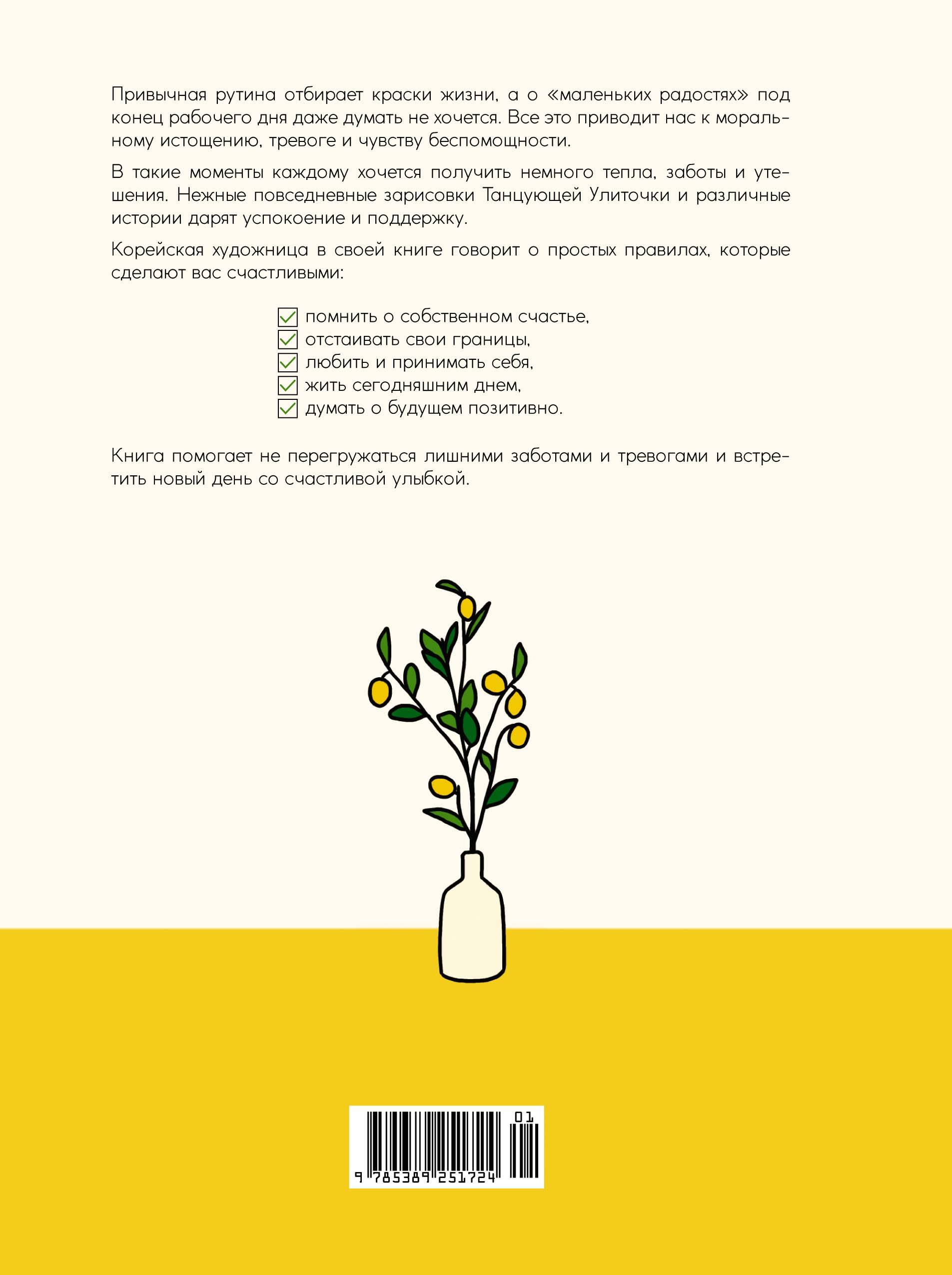 Привычная рутина отбирает краски жизни, а о "маленьких радостях" под конец рабочего дня даже думать не хочется. Все это приводит нас к моральному истощению, тревоге и чувству беспомощности. В такие моменты каждому хочется получить немного тепла, заботы и утешения. Нежные повседневные зарисовки Танцующей Улиточки и различные истории дарят успокоение и поддержку. Корейская художница в своей книге говорит о простых правилах, которые сделают вас счастливыми: помнить о собственном счастье, отстаивать свои границы, любить и принимать себя, жить сегодняшним днем, думать о будущем позитивно. Книга помогает не перегружаться лишними заботами и тревогами и встретить новый день со счастливой улыбкой.| Издательство | Азбука-Аттикус Издат.группа ООО |