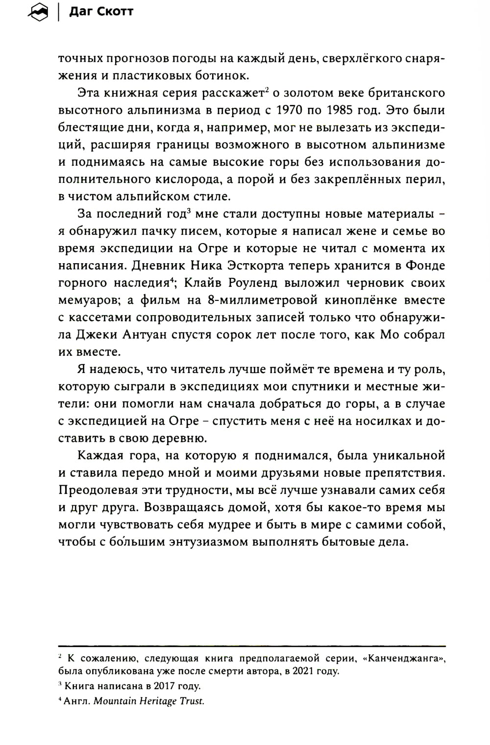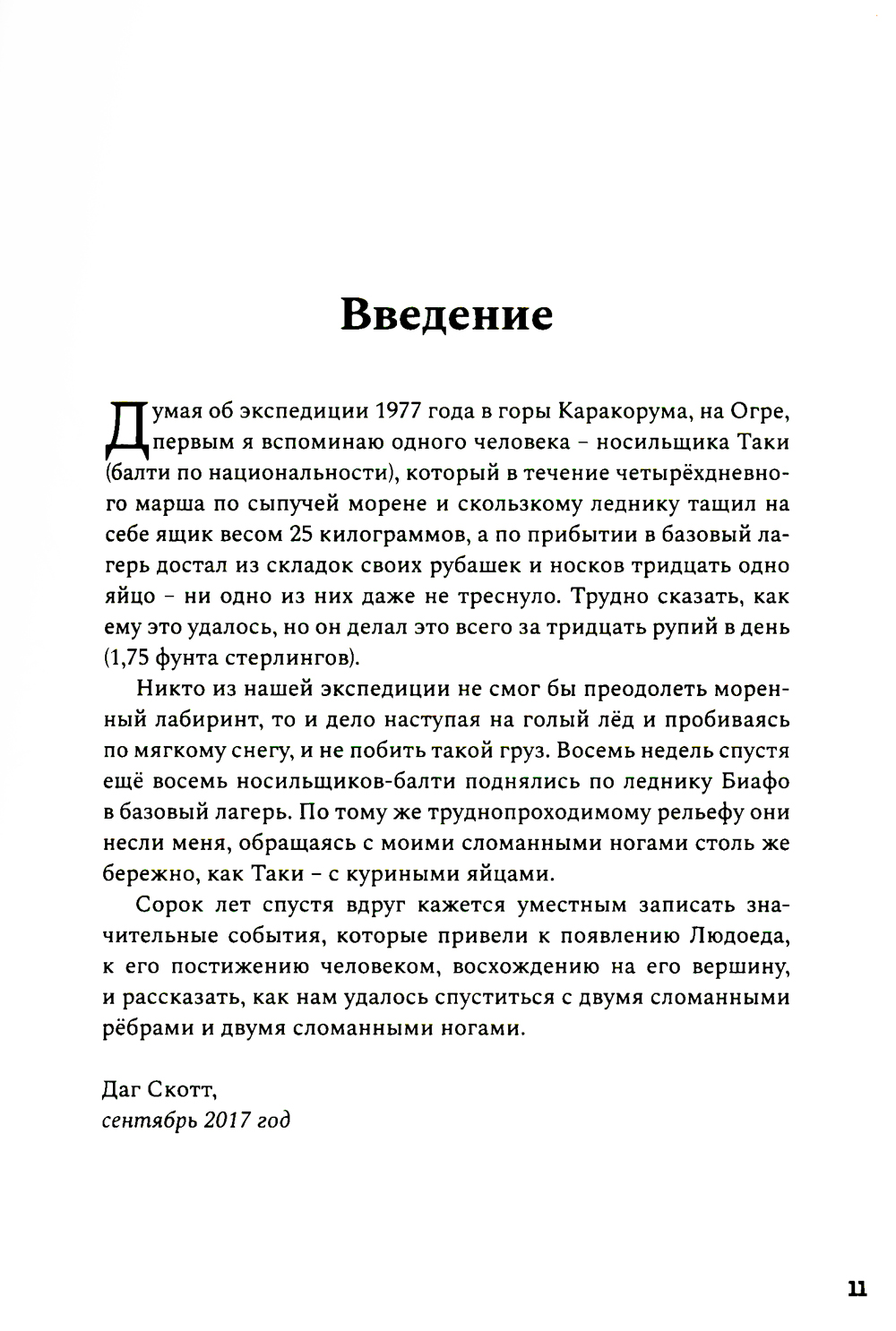 «Мерзкий холодный ветер дул, когда я покидал вершину, едва переставляя ноги по узкому фирновому гребешку, чтобы закрепить на скальном уступе петлю для первого дюльфера. Верёвки как раз хватило до трещины, и я попытался дотянуться до пары крючьев, забитых в щель на подъёме - они были просто вне досягаемости, поэтому я переступил ногами, чтобы удержать равновесие. Не глядя, я встал на полосу натёчного льда, образованного вечерним морозом. В тот неосторожный момент я потерял контроль...» Используя недавно найденные дневники своих партнёров по экспедиции, их письма и аудиозаписи, Даг Скотт рассказывает о своём восхождении на Баннтха-Бракк и самоотверженной роли напарников в своём спасении. Несомненно, «Людоед» - одна из величайших приключенческих историй всех времен.| Издательство | Библиотека Спорт-Марафон |