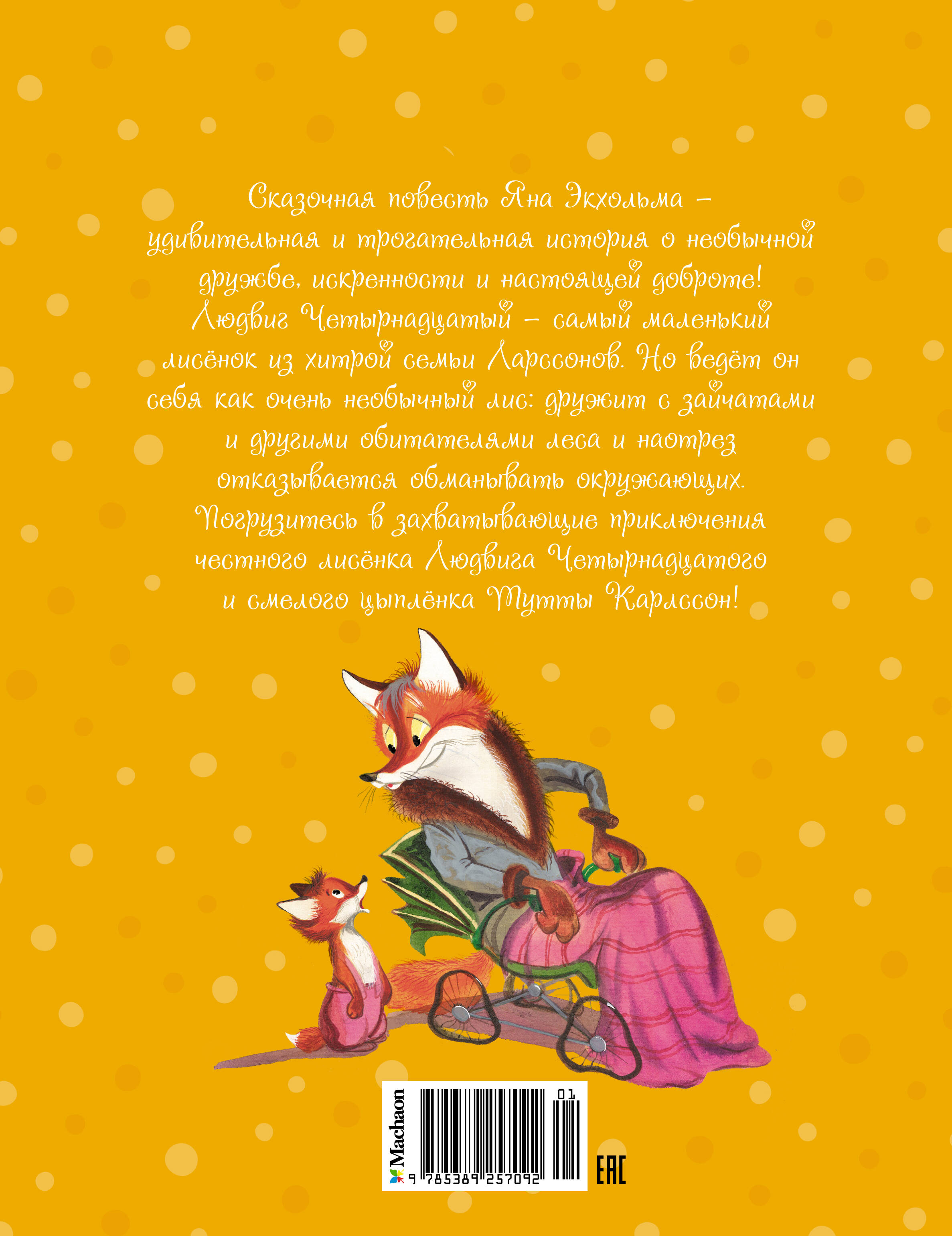 Сказка Яна Экхольма - удивительная и трогательная история о необычной дружбе, искренности и настоящей доброте! Людвиг Четырнадцатый - самый маленький лисёнок из хитрой семьи Ларссонов. Но ведёт он себя как очень необычный лис: дружит с зайчатами и другими обитателями леса и наотрез отказывается обманывать окружающих. Погрузитесь в захватывающие приключения честного лисёнка Людвига Четырнадцатого и смелого цыплёнка Тутты Карлссон!| Издательство | Азбука-Аттикус Издат.группа ООО |