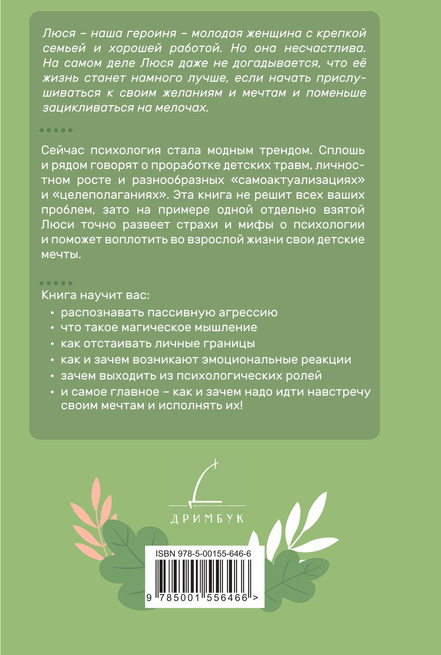 Люся - наша героиня - молодая женщина с крепкой семьей и хорошей работой. Но она несчастлива. На самом деле Люся даже не догадывается, что ее жизнь станет намного лучше, если начать прислушиваться к своим желаниям и мечтам и поменьше зацикливаться на мелочах. Сейчас психология стала модным трендом. Сплошь и рядом говорят о проработке детских травм, личностном росте и разнообразных "самоактуализациях" и "целеполаганиях". Эта книга не решит всех ваших проблем, зато на примере одной отдельно взятой Люси точно развеет страхи и мифы о психологии и поможет воплотить во взрослой жизни свои детские мечты. Книга научит вас распознавать пассивную агрессию, что такое магическое мышление, как отстаивать личные границы, как и зачем возникают эмоциональные реакции, зачем выходить из психологических ролей, и самое главное - как и зачем надо идти навстречу своим мечтам и исполнять их!| Издательство | Дримбук Издательство ООО |