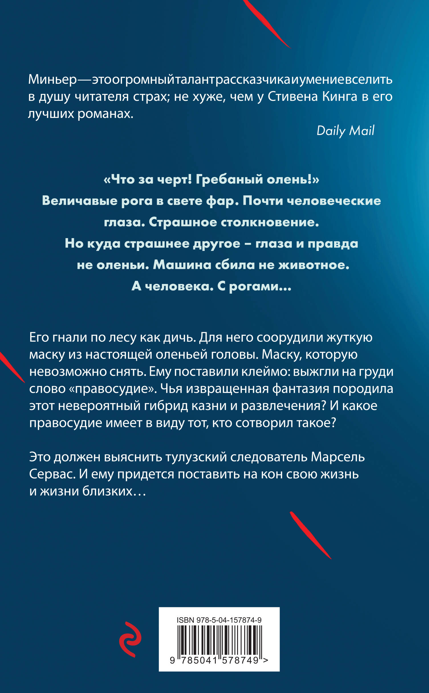 Изощренный и мрачный триллер от одного из самых популярных во Франции писателей. Есть тьма, которую не сможет рассеять ни одно солнце… «Что за черт! Гребаный олень!» Величавые рога в свете фар. Почти человеческие глаза. Страшное столкновение. Но куда страшнее другое - глаза и правда не оленьи. Машина сбила не животное. А человека. С рогами… Его гнали по лесу, как дичь. Для него соорудили жуткую маску из настоящей оленьей головы. Маску, которую невозможно снять. Ему поставили клеймо: выжгли на груди слово «правосудие». Чья извращенная фантазия породила этот невероятный гибрид казни и развлечения? И какое правосудие имеет в виду тот, кто сотворил такое? Это должен выяснить тулузский следователь Мартен Сервас. И ему придется поставить на кон свою жизнь и жизни близких… «Миньер - это огромный талант рассказчика и умение вселить в душу читателя страх; не хуже, чем у Стивена Кинга в его лучших романах». - Daily Mail «Новый король триллера». - El País «Миньер выдает прозу мрачную и острую. И такую густую, что пока читаешь, в ней вязнут пальцы». - Spectator «Романы Миньера ценятся за блестящую интригу и за ту откровенность, с которой он говорит о современном обществе». - Provence| Издательство | Эксмо |