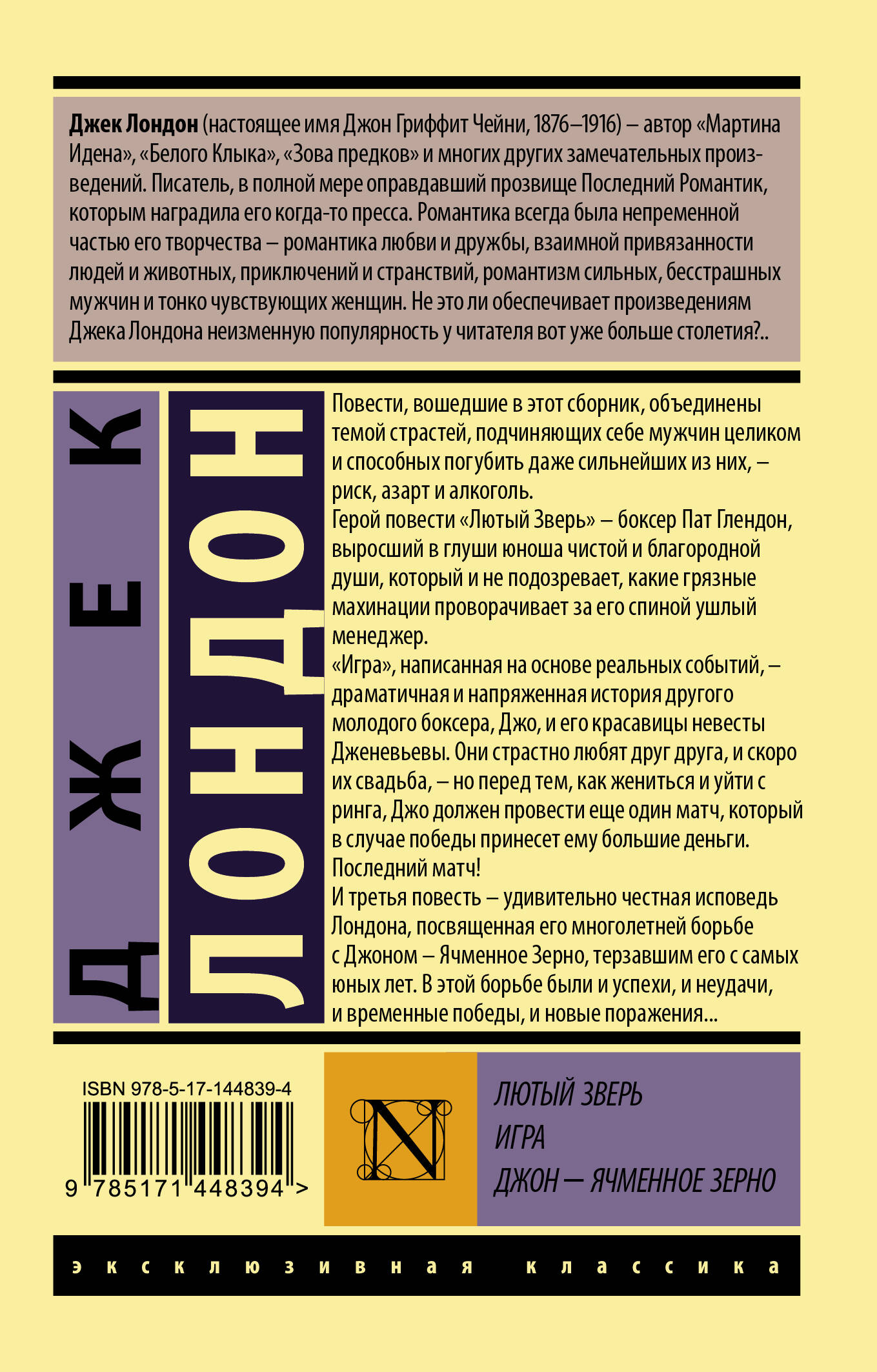 Повести, вошедшие в этот сборник, объединены темой страстей, подчиняющих себе мужчин целиком и способных погубить даже сильнейших из них - риск, азарт и алкоголь. Герой повести "Лютый Зверь" - боксер Пат Глендон, выросший в глуши юноша чистой и благородной души, который и не подозревает, какие грязные махинации проворачивает за его спиной ушлый менеджер. "Игра", написанная на основе реальных событий, - драматичная и напряженная история другого молодого боксера Джо и его красавицы невесты Дженевьевы. Они страстно любят друг друга, и скоро их свадьба, - но перед тем, как жениться и уйти с ринга, Джо должен провести еще один матч, который, в случае победы, принесет ему большие деньги. Последний матч! И третья повесть - удивительно честная исповедь Лондона, посвященная его многолетней борьбе с Джоном - Ячменное Зерно, терзавшим его с самых юных лет. В этой борьбе были и успехи, и неудачи, и временные победы, и новые поражения...| Издательство | Издательство "АСТ" |
