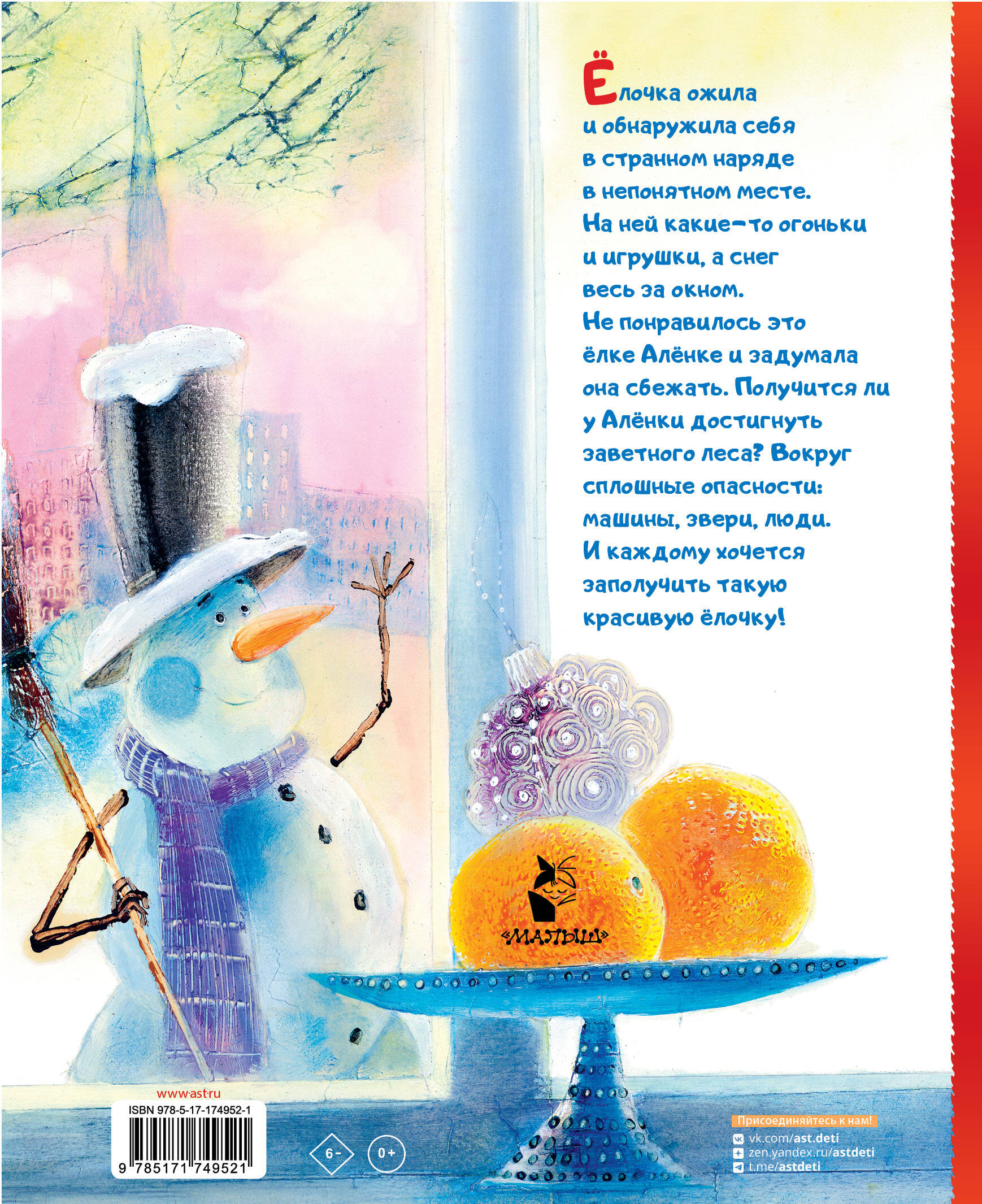 Ёлочка ожила и обнаружила себя в странном наряде в непонятном месте. На ней какие -то огоньки и игрушки, а снег весь за окном. Не понравилось это ёлке Алёнке и задумала она сбежать. Получится ли у Алёнки достигнуть заветного леса? Вокруг сплошные опасности: машины, звери, люди. И каждому хочется заполучить такую красивую ёлочку!| Издательство | Издательство "АСТ" |