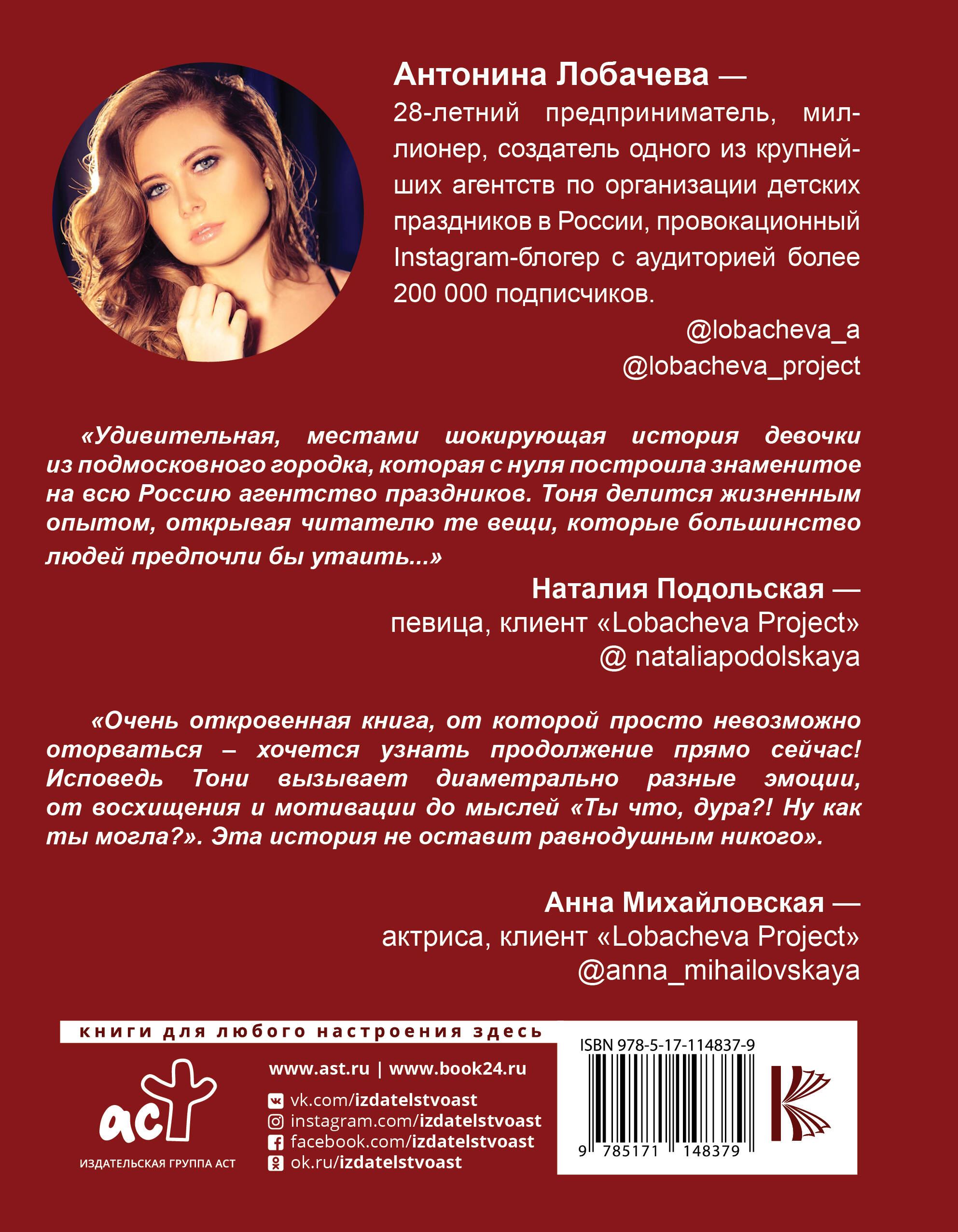Шокирующая история успеха 28-летней девушки-предпринимателя Антонины Лобачевой. В 2010 году Тоня начала работать детским аниматором, назначив за свою работу самую низкую цену в подмосковном городке. Сегодня Антонина - миллионер и владелица одного из крупнейших агентств детских праздников в России. Как ей это удалось? Ответы вы найдете в этой книге. История с первых страниц поражает своей откровенностью и искренностью - далеко не каждый человек мог бы рассказать даже близким людям то, на что решилась эта смелая и немного странная девушка. В книге вы найдете более 30 советов по достижению успеха, которые автору удалось извлечь из весьма непростых жизненных уроков. История написана эмоционально и с потрясающей самоиронией. Единственный минус этой книги в том, что вы не сможете остановиться - начав читать ее, вы будете жаждать продолжения снова и снова! Эта книга - глоток свежего воздуха, после которого ваша жизнь никогда не станет прежней....| Издательство | ИЗДАТЕЛЬСТВО "АСТ" |