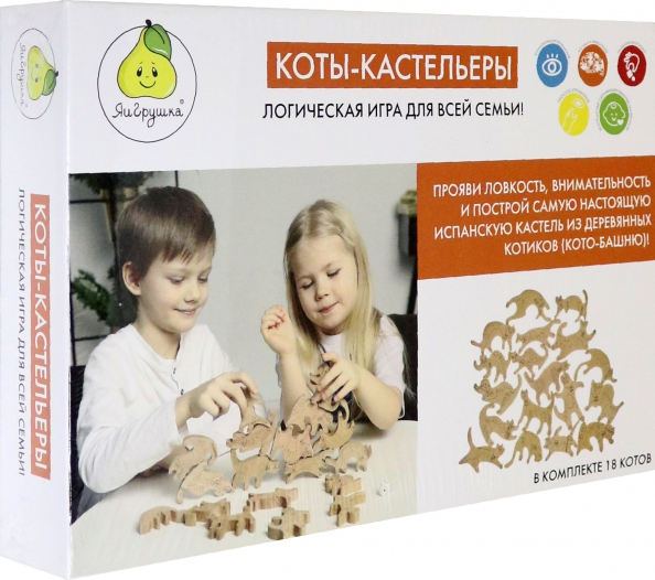 В наборе 18 котов с персональной цифрой и игральный кубик для самых смелых! Все котики совершенно разные! Подкидывайте кубик и ставьте котиков с определенными номерами друг на друга! Победит тот, чей котик заберется выше и сохранит баланс, как настоящий испанский кастельер.