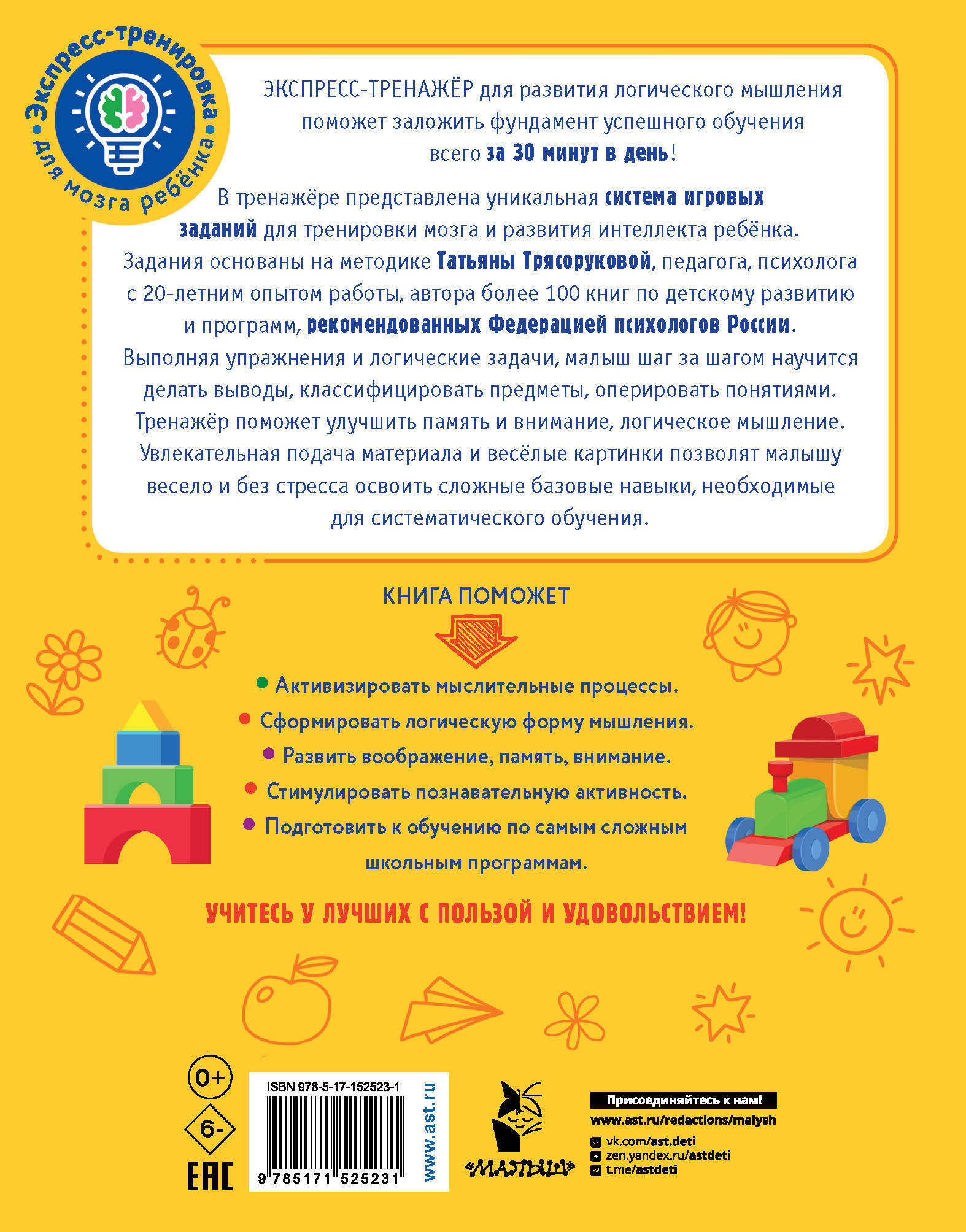 В тренажёре представлена уникальная система игровых заданий для развития логического мышления ребёнка 5-7 лет. Задания основаны на методике Т. Трясоруковой, опытного педагога, психолога, автора книг по развитию детей и программ, рекомендованных Федерацией психологов России. Ребёнок шаг за шагом научится делать выводы, классифицировать предметы, оперировать понятиями. Увлекательная подача материала позволит укрепить познавательный интерес, без стресса освоить сложные навыки, необходимые для систематического обучения.| Издательство | ИЗДАТЕЛЬСТВО "АСТ" |