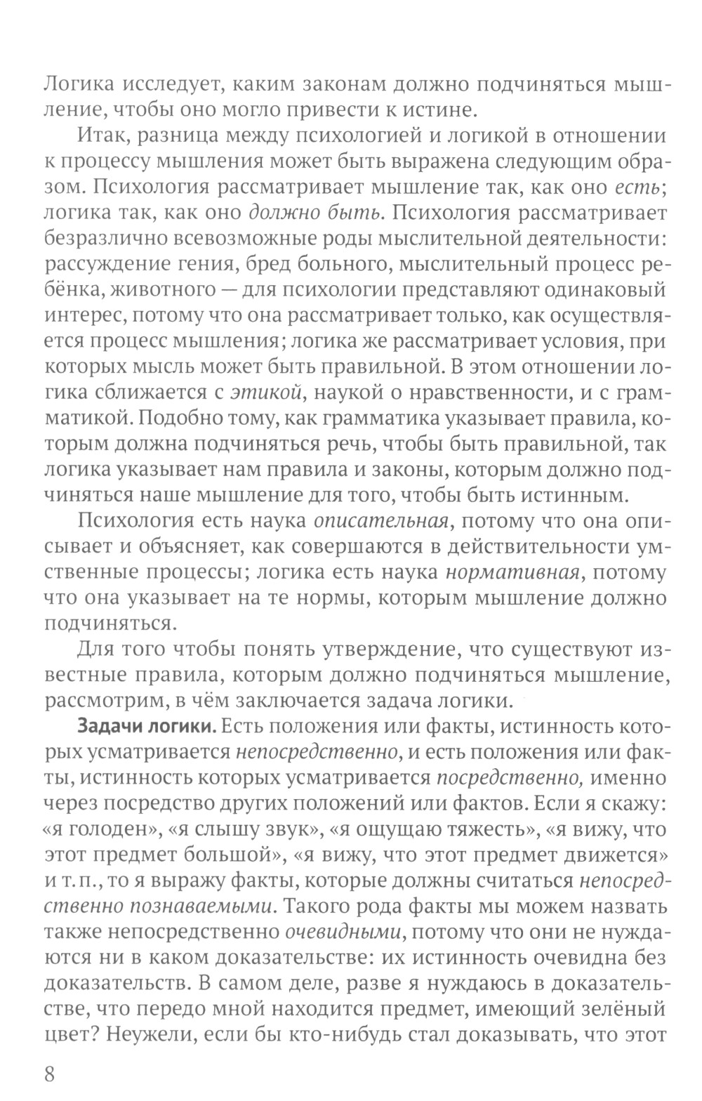 Какие законы управляют нашим мышлением? Чем здравый смысл отличается от логики? Что такое «логический квадрат»? Как отличить прямые доказательства от косвенных? На эти и многие другие вопросы поможет ответить логика - наука о формах и законах правильного мышления, основателем которой является древнегреческий ученый Аристотель. Эта дисциплина помогает установить истину, сохранять ясность ума и стройность мышления, избегать ошибок и ловушек разума. Перед вами учебник логики под авторством психолога и философа Г.И. Челпанова. Он был отмечен премией Императора Петра Великого и до революции выдержал множество изданий. В 1946 году книга выходила в СССР, но в сокращенной версии. Настоящий текст печатается с самого последнего полного 9-го издания 1918 года в современной орфографии. Издание содержит наглядные схемы и таблицы, а также вопросы для закрепления материала в конце каждой главы. Книга будет полезна не только учащимся и преподавателям, но и всем, кто критически воспринимает информацию и стремится делать выводы самостоятельно.