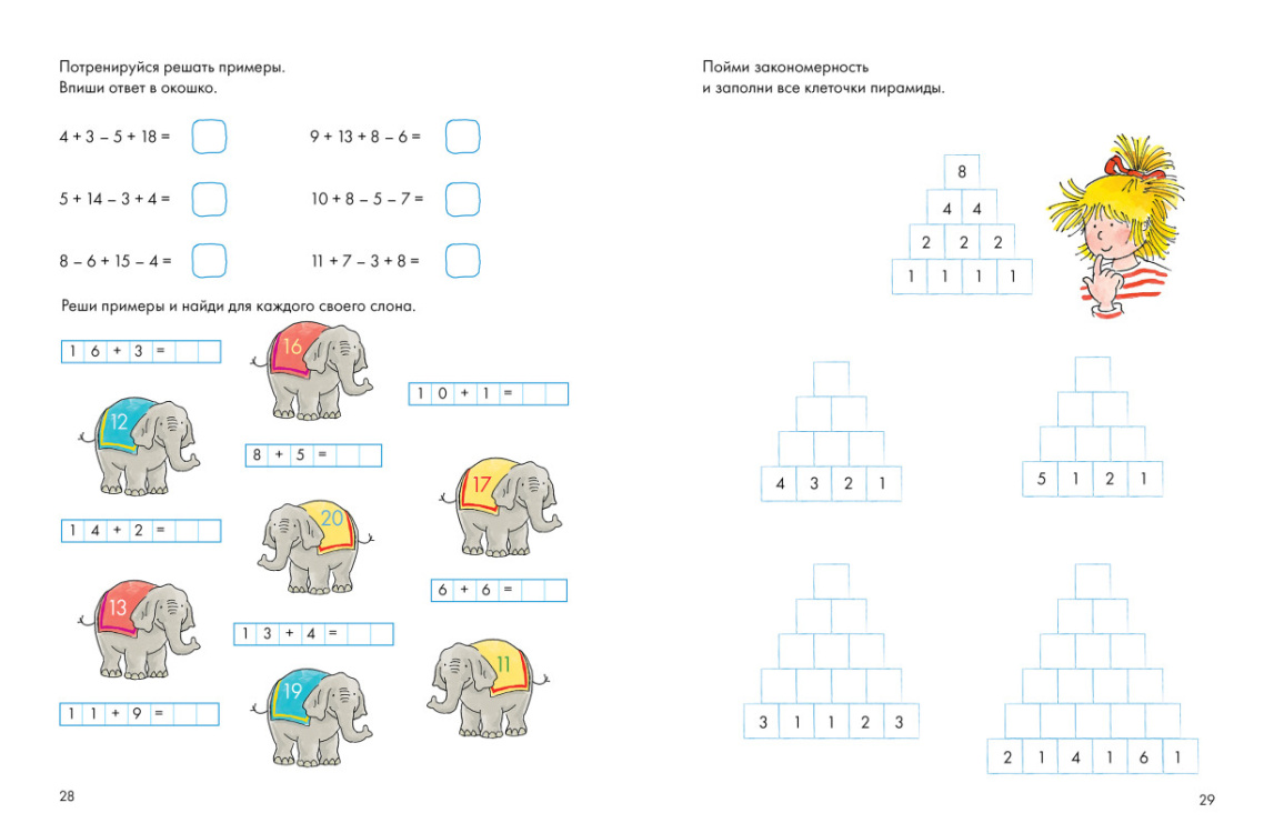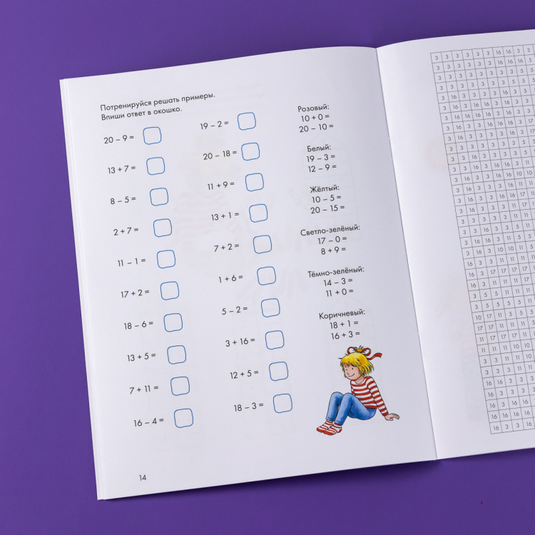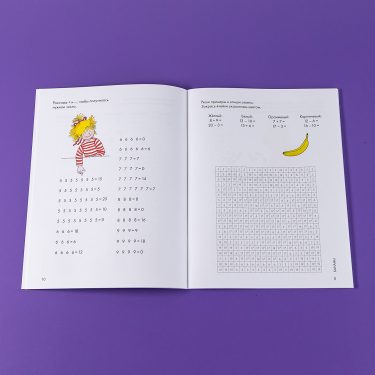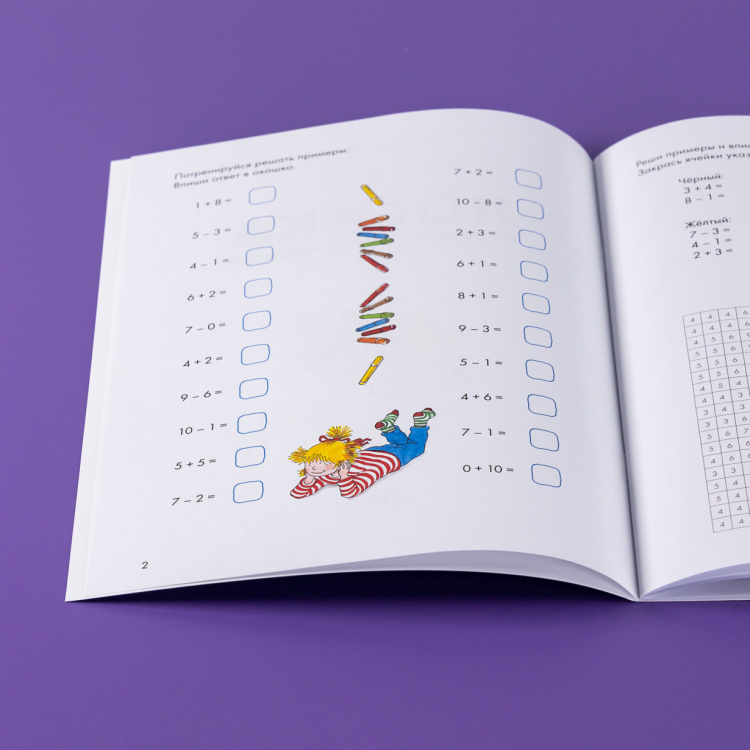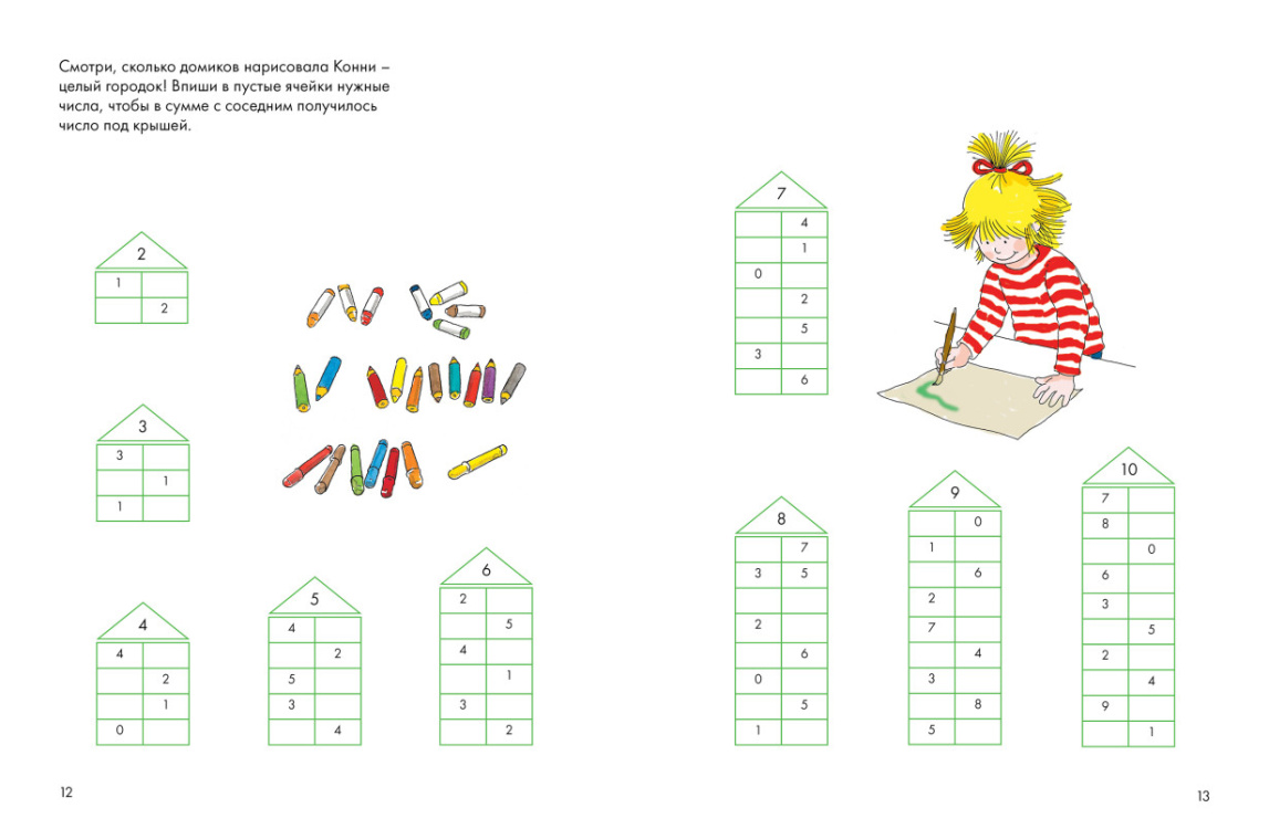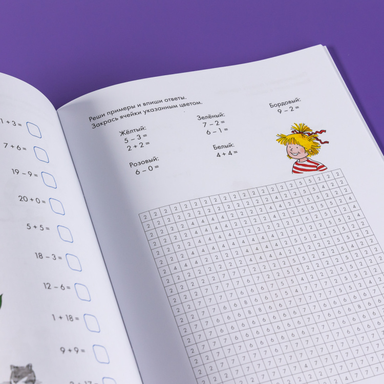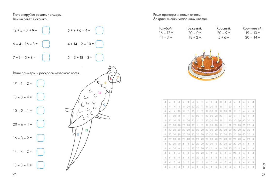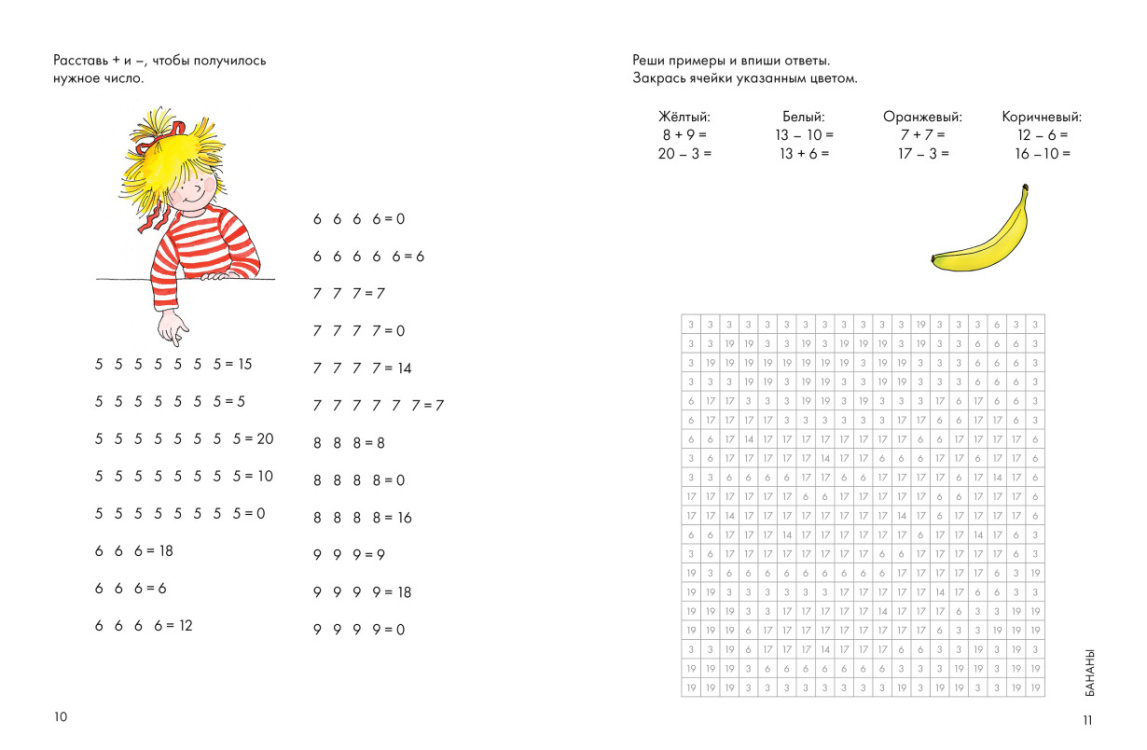 Увлекательные задания для развития навыков счета, с помощью которых ребенок сможет не только довести навык счета до автоматизма, но и развить логику, мелкую моторику и внимание, а также проявить творческие способности, дополнив рисунки своими задумками. Решайте примеры и закрашивайте клеточки в нужный цвет, чтобы получить яркую картинку. Это занятие увлечет даже самых непоседливых детей - ведь так интересно узнать, что же зашифровала Конни на рисунках!