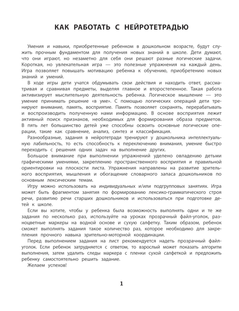 Логические игры, представленные в пособии, учат детей обдумывать свои действия и находить ответ, рассматривая и сравнивая предметы, выделяя главное и второстепенное, активизируя таким образом мыслительную деятельность ребенка. Пособие направлено на развитие мышления, внимания, зрительного восприятия, памяти, обогащение словарного запаса дошкольников по основным лексическим темам. Таким образом, подключая работу обоих полушарий мозга, дети осваивают основные логические операции (сравнение, анализ, синтез и классификация) наряду с расширением объема активного и пассивного словаря. Большое внимание при выполнении упражнений уделено овладению детьми графическими умениями, закреплению пространственного восприятия и правильной ориентировки на плоскости листа. Разнообразные задания в нейротетради тренируют у дошкольника способность к переключению внимания, умение быстро переходить с решения одних задач на выполнение других. Все эти умения и навыки, приобретенные ребенком в дошкольном возрасте, будут служить прочным фундаментом для получения новых знаний в школе. Комплексные упражнения нейротетради адресованы детям старшего дошкольного возраста и их заинтересованным родителям, могут быть использованы в работе логопедами, психологами, воспитателями, гувернерами.| Издательство | Феникс |