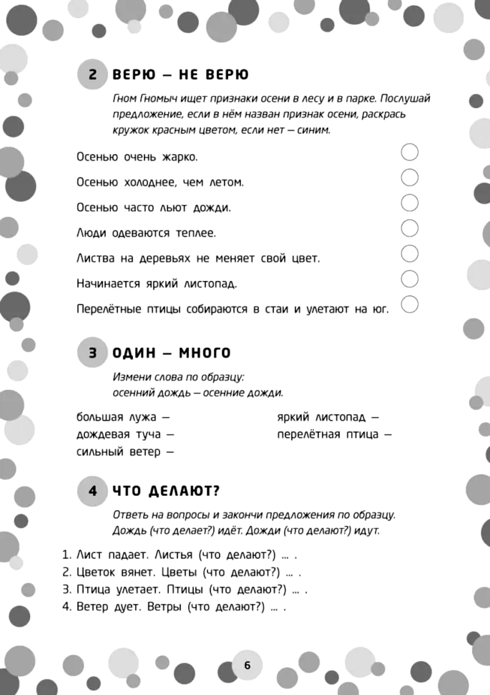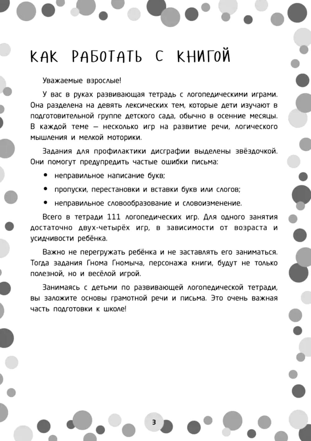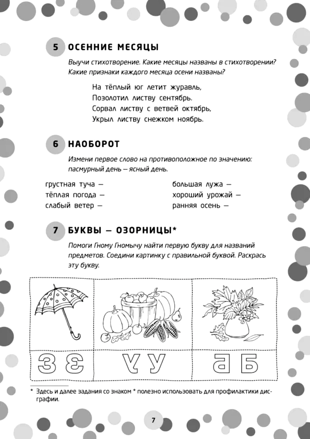 Годовой курс занятий для подготовки детей 5-7 лет к школе от опытного логопеда. Часть 1, «Осень». Пригодится родителям дошкольников, воспитателям подготовительных групп детских садов. В тетради 111 логопедических игр на развитие речи, логического мышления и мелкой моторики. Задания для профилактики дисграфии выделены звездочкой: они помогут предупредить частые ошибки письма. Для одного занятия достаточно двух-четырёх игр. Занимаясь с ребенком по развивающей логопедической тетради, вы заложите основы грамотной речи и письма. Это очень важная часть подготовки к школе!| Издательство | Каро |