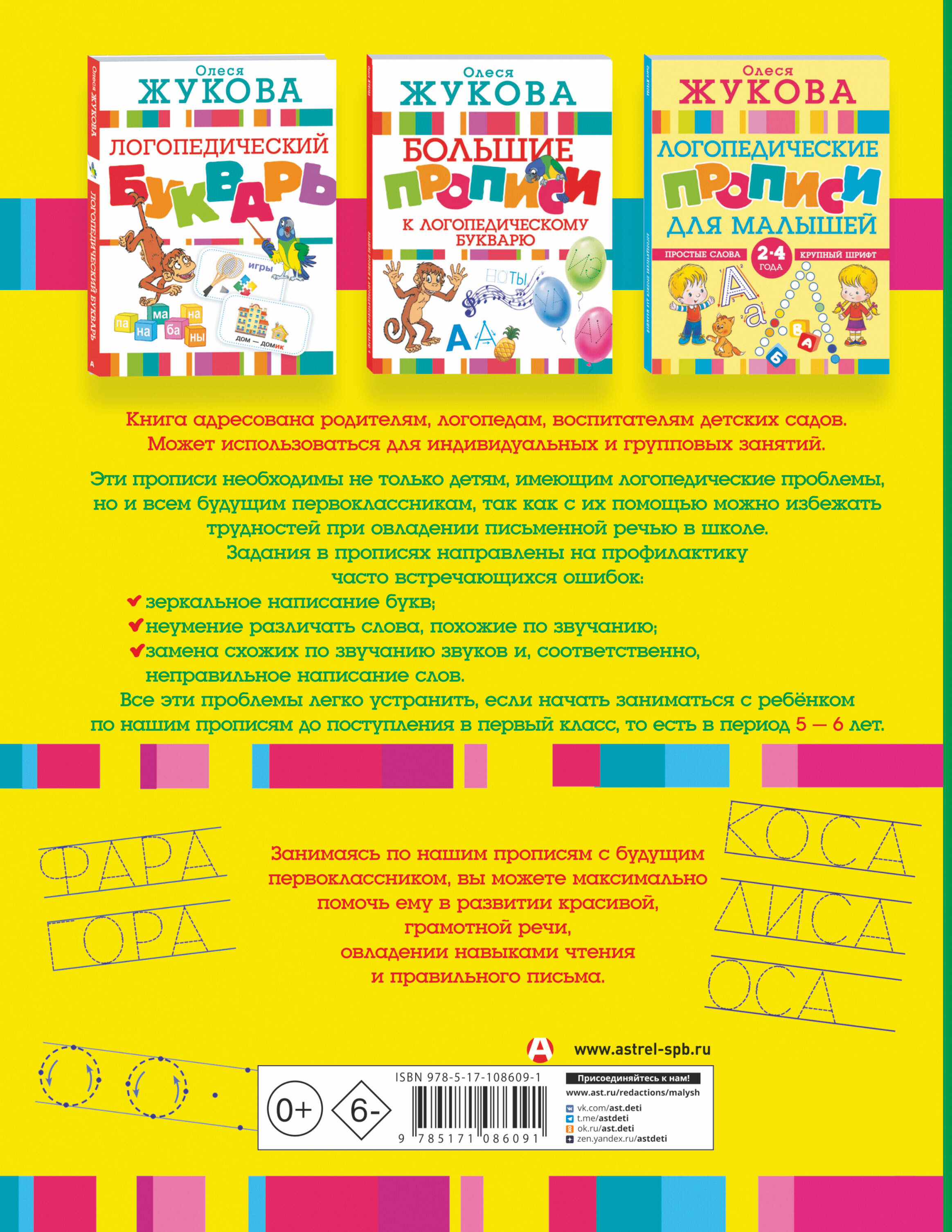 "Логопедические прописи для будущего первоклассника" необходимы не только детям, имеющим логопедические проблемы, но и всем будущим первоклассникам, так как с их помощью можно избежать трудностей при овладении письменной речью в школе. Задания в прописях направлены на профилактику часто встречающихся ошибок: зеркальное написание букв (Я-R; Е-Ǝ и т. п.); неумение различать слова, похожие по звучанию (например, сом - том - ком и т. п.); замена схожих по звучанию звуков и, соответственно, неправильное написание слов (например, зайка - сайка; кошка - коска). Все эти проблемы легко устранить, если начать заниматься с ребенком по нашим прописям до поступления в первый класс, то есть в период 5 -6 лет. Для дошкольного возраста.| Издательство | ИЗДАТЕЛЬСТВО "АСТ" |