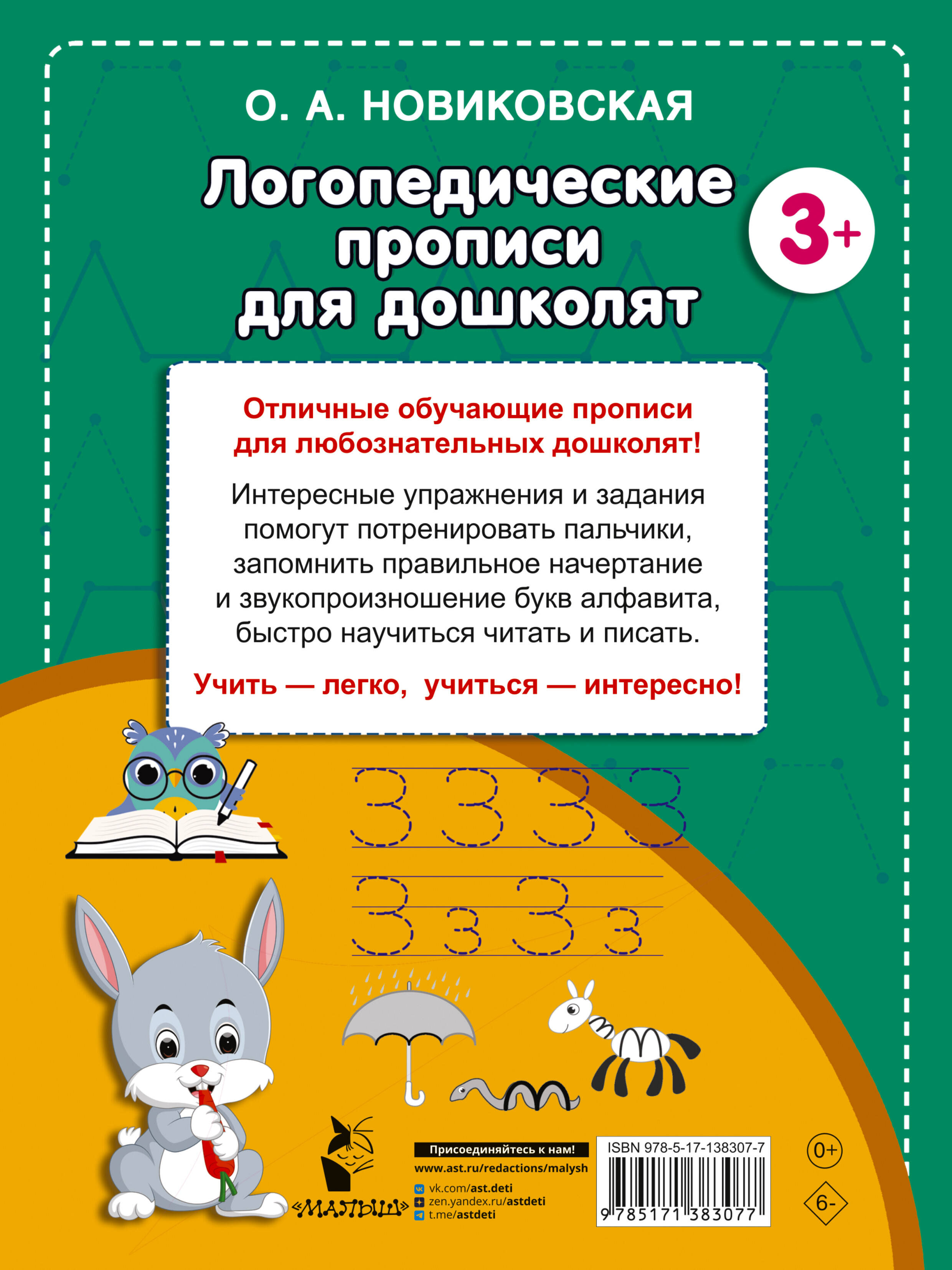 О чём эта книга Прописи для дошколят, разработанные О.А. Новиковской - известным педагогом, логопедом высшей категории, содержат . Кому эта книга будет интересна Педагогам дополнительного образования и родителям для занятий с детьми дошкольного возраста. Каковы особенности этой книги • Ребёнку предлагается активно включиться в игровую ситуацию - малыш рисует, обводит, раскрашивает, запоминает буквы и цифры, обогащает словарный запас и расширяет кругозор. • Заниматься по книге интересно и удобно. Игровые упражнения и задания помогут потренировать пальчики, запомнить правильное начертание и звукопроизношение букв алфавита, быстро научиться читать, считать и писать. • В книгу вошли обучающие задания на развитие речи, внимания, памяти, мышления, творческого воображения и мелкой моторики.| Издательство | АСТ |