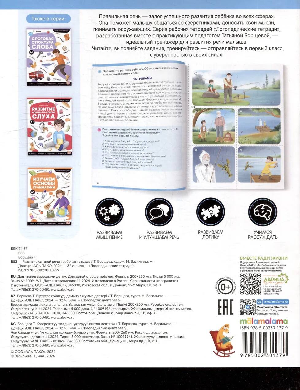 Логопедическая тетрадь "Развитие связной речи" от торговой марки Malamalama - это незаменимый инструмент для родителей детей с нарушениями речи. В рабочей тетради собраны эффективные логопедические упражнения, разработанные с учетом возрастных особенностей детей и направленные на тренировку и развитие связной речи в диалоге и монологе. Каждое упражнение сопровождается подробными инструкциями, что позволяет легко и эффективно проводить занятия дома. Сборник поможет сделать работу по коррекции и развитию речи интересной для детей разного возраста и уровня развития речи.