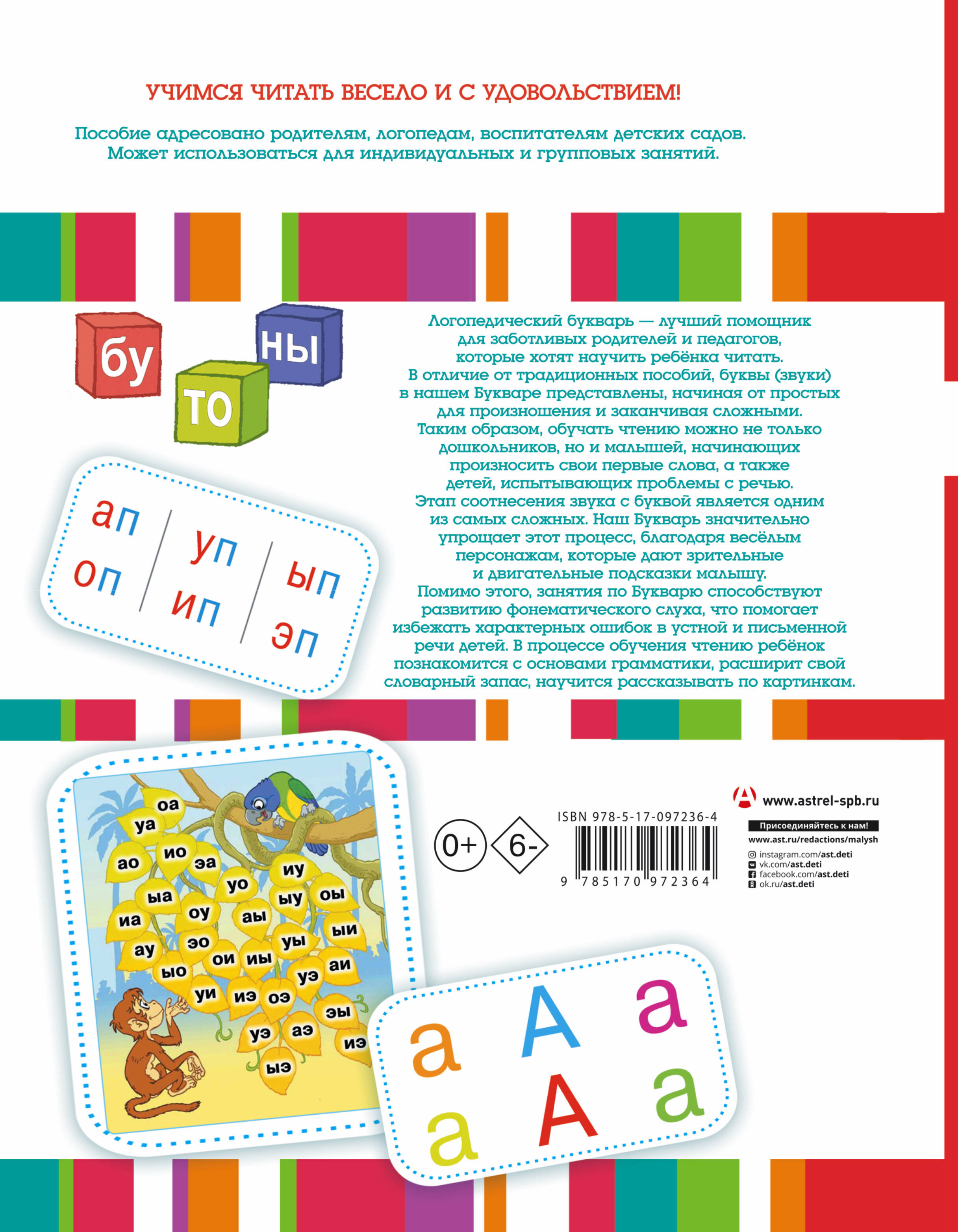 В отличие от традиционных пособий, буквы (звуки) в нашем Букваре представлены, начиная от простых для произношения и заканчивая сложными. Таким образом обучать чтению можно не только дошкольников, но и малышей, начинающих произносить свои первые слова; детей, испытывающих проблемы с речью. Этап соотнесения звука с буквой является одним из самых сложных. Наш Букварь значительно упрощает этот процесс, благодаря веселым персонажам, которые дают зрительные и двигательные подсказки малышу.| Издательство | ИЗДАТЕЛЬСТВО "АСТ" |