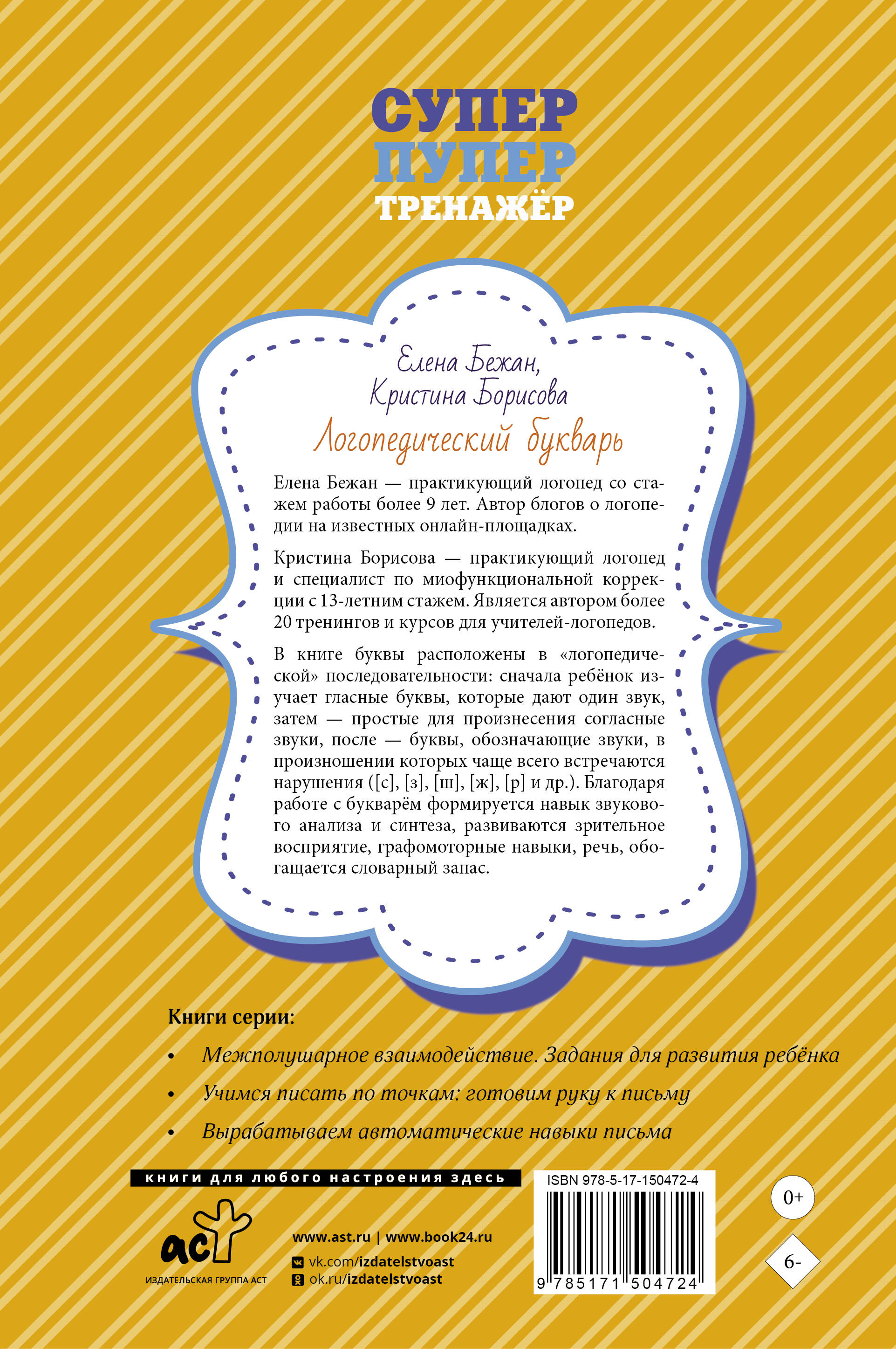 Елена Бежан - практикующий логопед со стажем работы более 9 лет. Автор блогов о логопедии на известных онлайн-площадках. Более 2000 специалистов успешно прошли курсы для логопедов, разработанные Еленой Бежан. Кристина Борисова - практикующий логопед и специалист по миофункциональной коррекции с 13-летним стажем. Является экспертом логопедических сообществ, автором более 20 тренингов и курсов для учителей-логопедов. В данной книге буквы расположены в особой "логопедической" последовательности: сначала ребёнок изучает гласные буквы, которые дают один звук, затем - простые для произнесения согласные звуки, после - буквы, обозначающие звуки, в произношении которых чаще всего встречаются нарушения ([с], [з], [ш], [ж], [р] и др.). Благодаря работе с букварём формируется навык звукового анализа и синтеза, развиваются фонематический слух, зрительное восприятие, мышление и внимание, пространственное ориентирование, графомоторные навыки, обогащается словарный запас, развивается речь. Пособие удобного формата адресовано родителям, логопедам и воспитателям детских садов. Подходит для индивидуальных и групповых занятий.