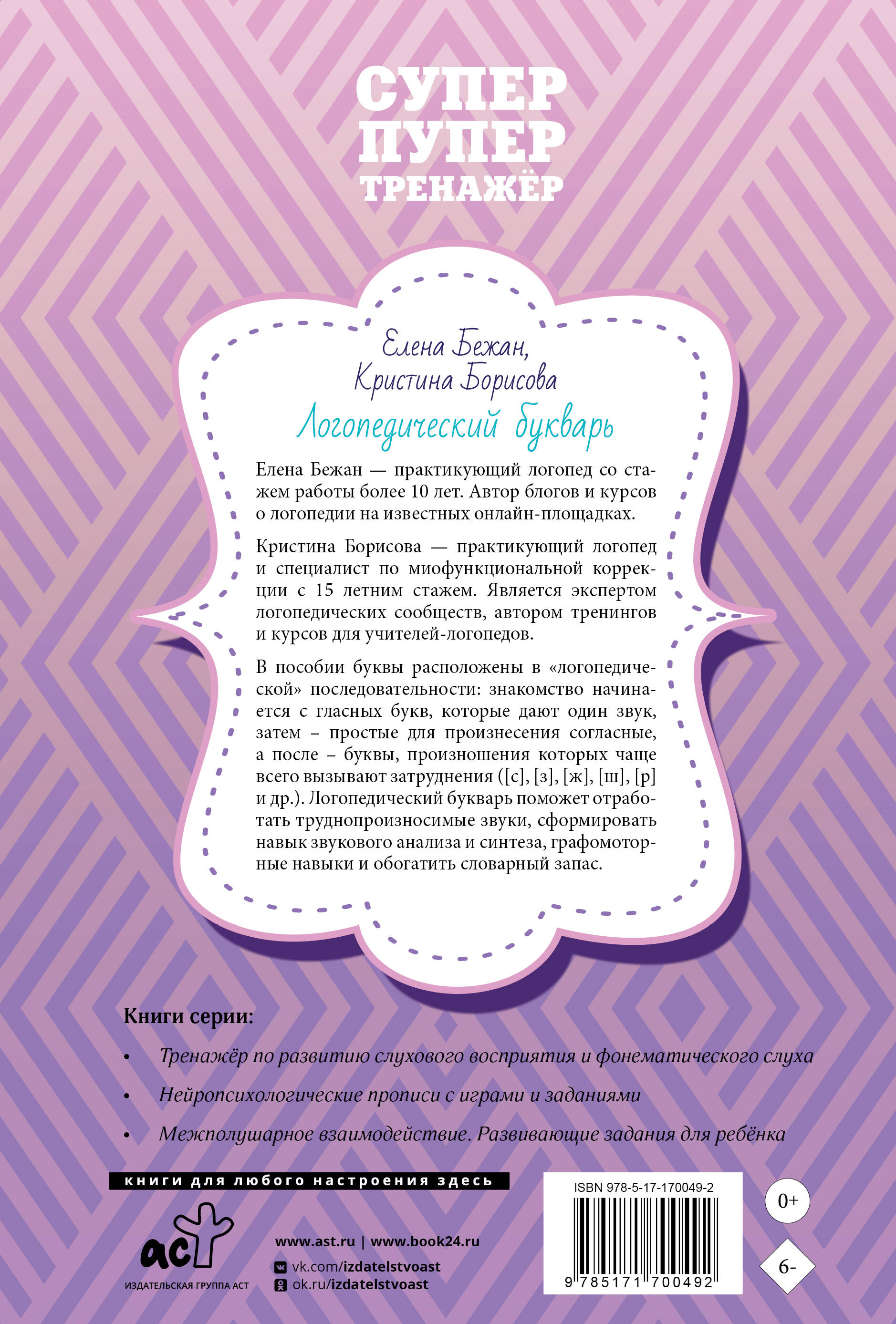 Елена Бежан - практикующий логопед со стажем работы более 9 лет. Автор блогов о логопедии на известных онлайн-площадках. Более 2000 специалистов успешно прошли курсы для логопедов, разработанные Еленой Бежан. Кристина Борисова - практикующий логопед и специалист по миофункциональной коррекции с 13-летним стажем. Является экспертом логопедических сообществ, автором более 20 тренингов и курсов для учителей-логопедов. В данной книге буквы расположены в особой "логопедической" последовательности: сначала ребёнок изучает гласные буквы, которые дают один звук, затем - простые для произнесения согласные звуки, после - буквы, обозначающие звуки, в произношении которых чаще всего встречаются нарушения ([с], [з], [ш], [ж], [р] и др.). Благодаря работе с букварём формируется навык звукового анализа и синтеза, развиваются фонематический слух, зрительное восприятие, мышление и внимание, пространственное ориентирование, графомоторные навыки, обогащается словарный запас, развивается речь. Пособие удобного формата адресовано родителям, логопедам и воспитателям детских садов. Подходит для индивидуальных и групповых занятий.| Издательство | Издательство "АСТ" |
