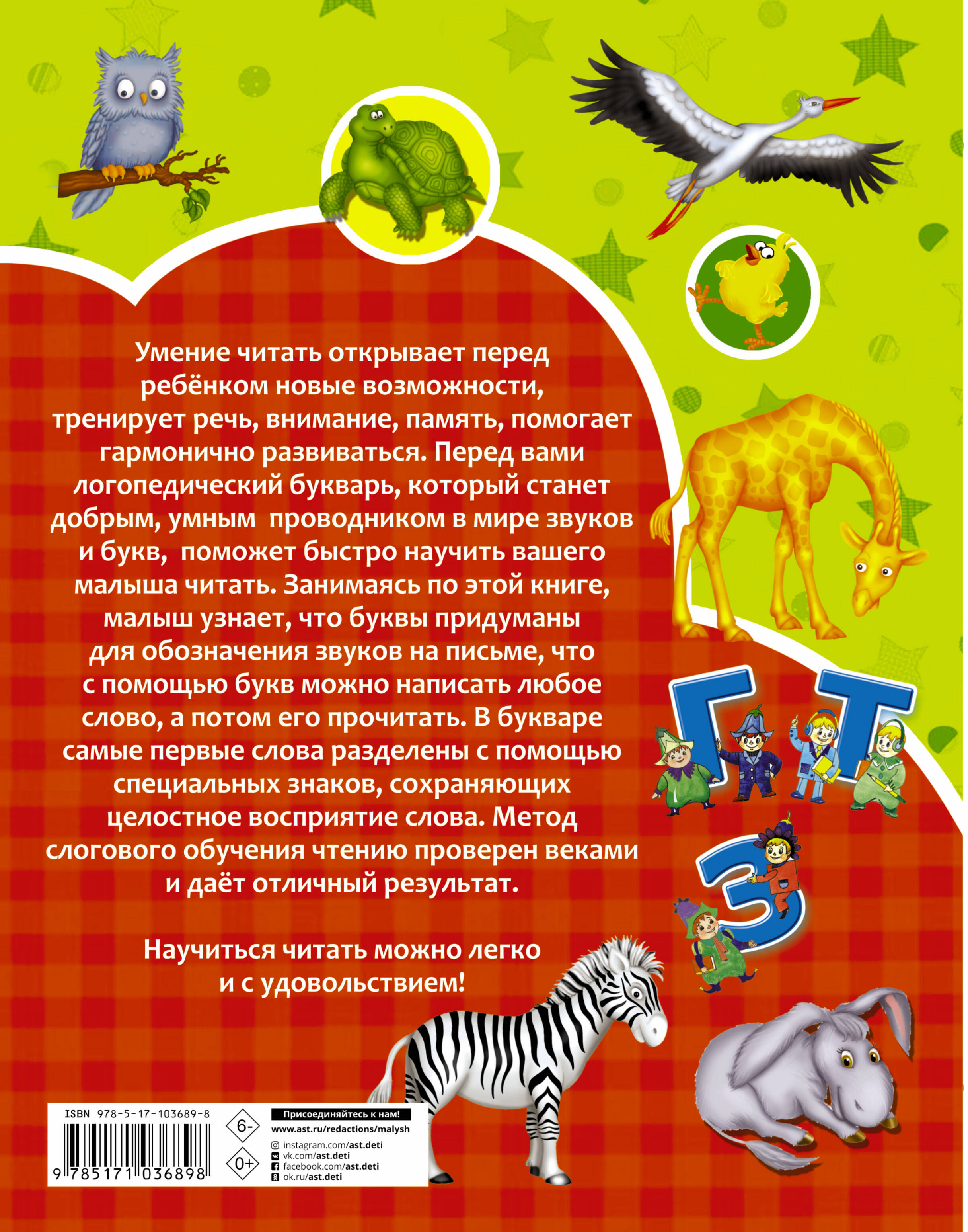О чем эта книга Вы держите в руках «Логопедический букварь», созданный по авторской методике Ольги Андреевны Новиковской - известного логопеда, успешного педагога-практика с 25-летним опытом работы. Кому эта книга будет интересна Уникальное пособие разработано в помощь родителям, книга предназначена для совместных занятий взрослого и ребенка 4 - 5 лет. Каковы особенности этой книги - «Два в одном» - логопедический букварь представляет собой увлекательное путешествие в Страну звуков и комплекс слогового обучения чтению. - Интересные задания подобраны с учетом возрастных особенностей детей 4 - 5 лет. - Большое внимание уделено описанию игр с буквами и звуками. - Одновременное развитие мелкой моторики и речи поможет ребенку достичь успехов в изучении родного языка. Малыш прочитает свои первые слова, научится правильно и красиво говорить, обогатит словарный запас.| Издательство | ИЗДАТЕЛЬСТВО "АСТ" |