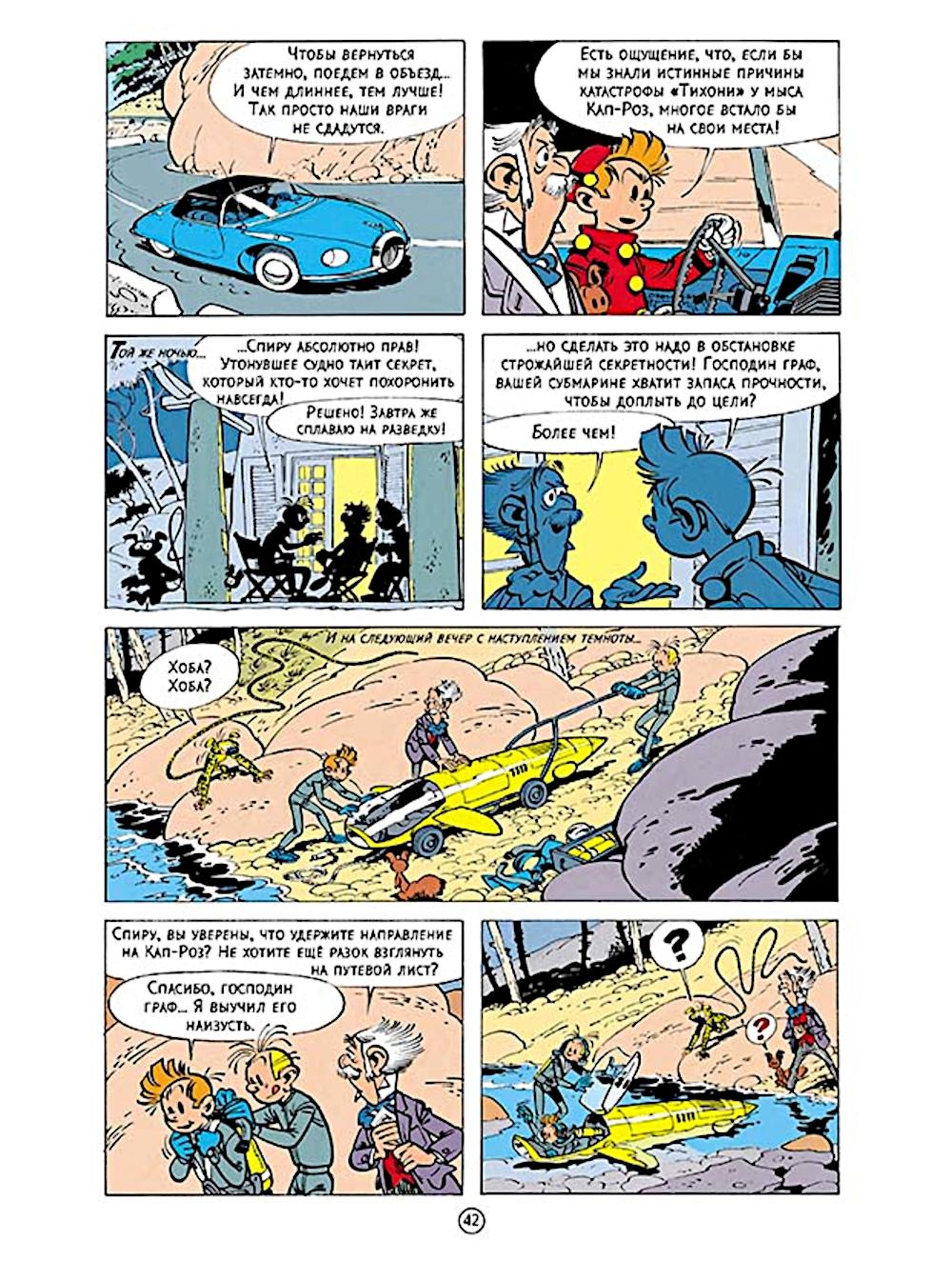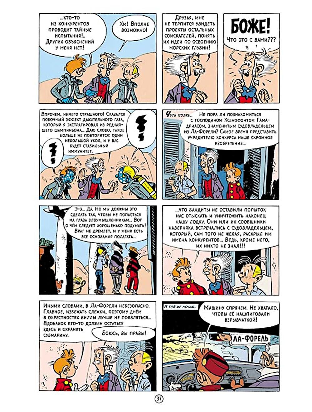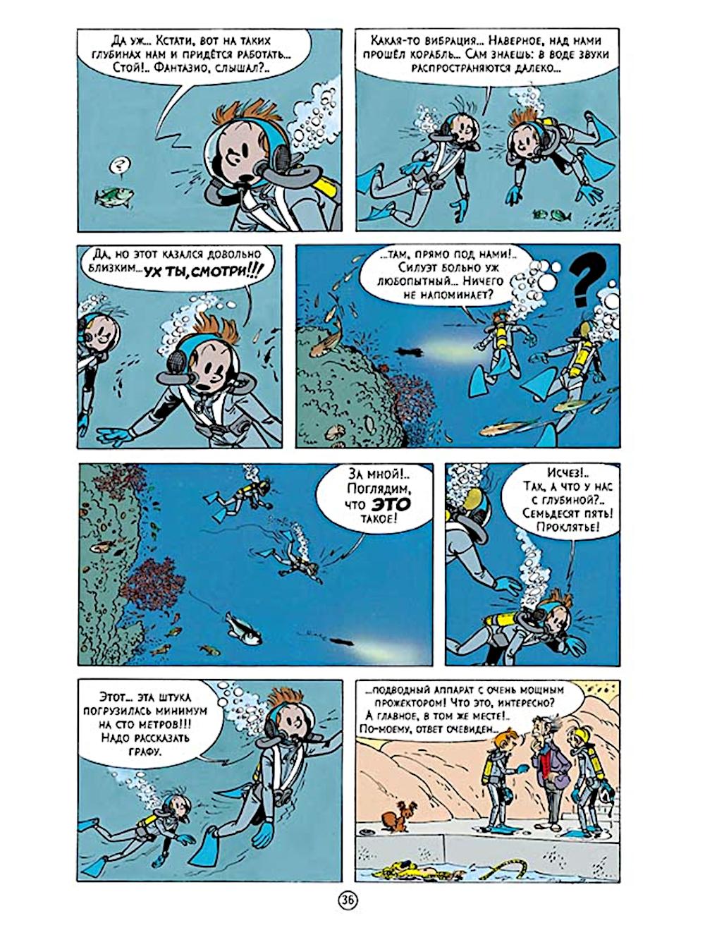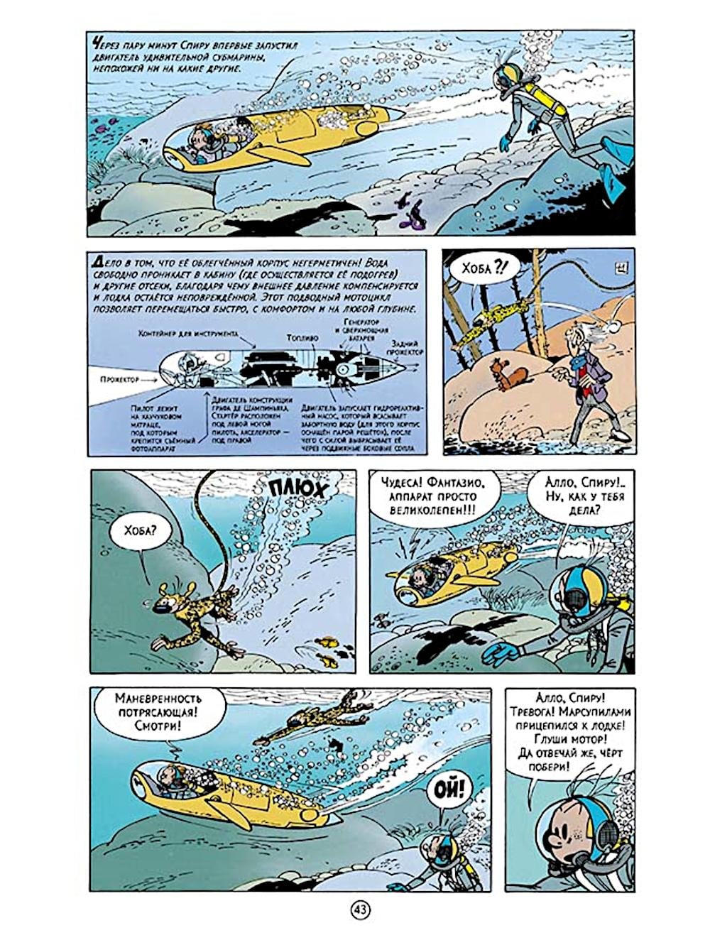Спиру и Фантазио гостили у своего учёного друга графа де Шампиньяка, когда на глаза им попалась заметка о том, что некий богатый судовладелец объявил конкурс на создание аппарата для глубоководных работ. Профессор Шампиньяк загорелся этой идеей и быстро набросал схему водолазного скафандра и подводной лодки. Чертежи были отправлены на завод измерительных приборов и учредителю премии Ксенофонту Гамадриасу. Спиру и не подозревал, что, бросая в почтовый ящик письмо, он прокладывает себе путь в логово мурены. Спустя неделю началась череда странных событий. Грузовик, который вёз детали для подводного аппарата, потерял управление, а потом загорелся. Расследование показало, что шину пробила пуля, а грузовик подожгли. Пришлось заказывать весь комплект оборудования заново. Спустя месяц в мастерской замка произошёл взрыв, который уничтожил почти готовую подводную лодку. А днём ранее такой же взрыв разрушил лабораторию другого соискателя, который был тяжело ранен. Дело принимало опасный оборот: кто-то методично убирал с пути конкурентов. Спиру и его друзья решили перебраться в город, где им удалось закончить постройку субмарины. Гамадриас, которому они представили своё изобретение, раскрыл им истинную цель конкурса - отыскать его корабль, потерпевший крушение у мыса Кап-Роз, и кое-что поднять с глубины 200 метров. После этого разговора неизвестные попытались похитить Спиру и графа де Шампиньяка, которым лишь чудом удалось вырваться. И тогда друзья решили продолжить поиски затонувшего корабля тайно и на свой страх и риск...| Издательство | Мелик-Пашаев |