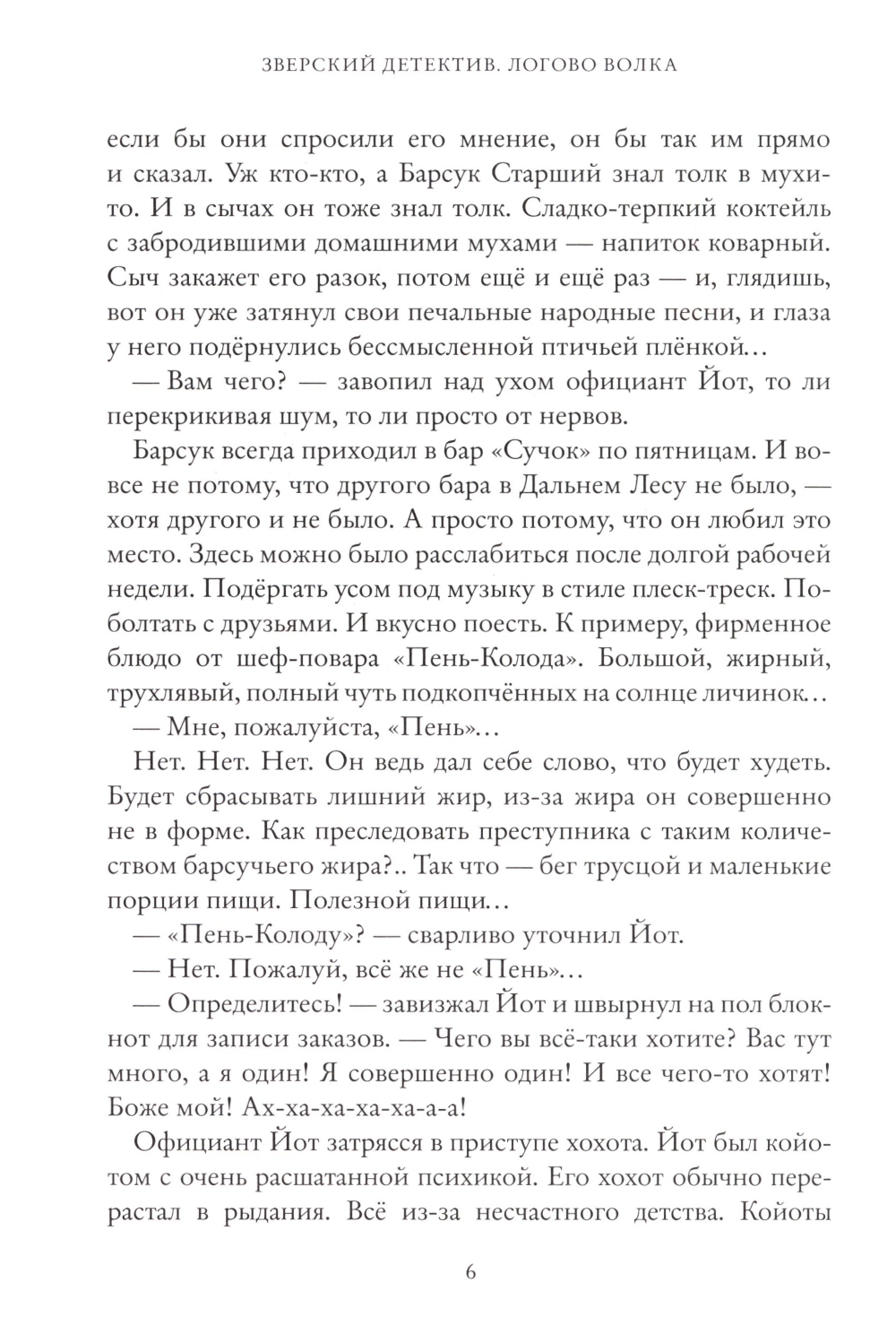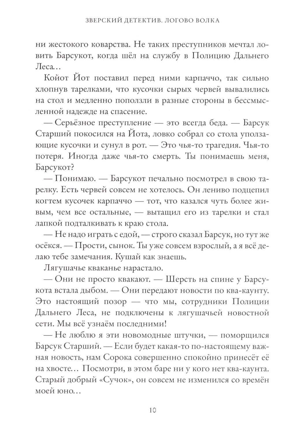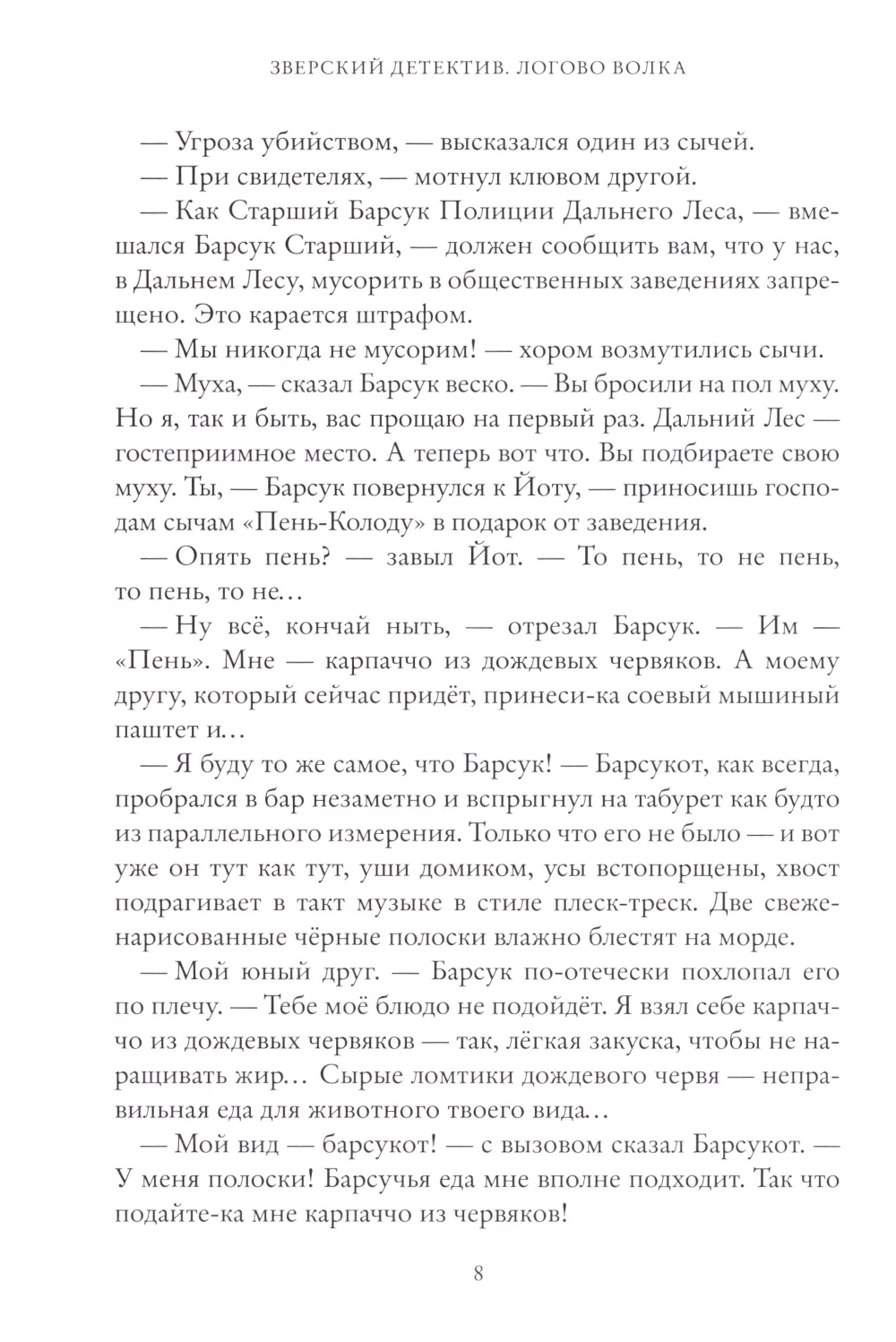 Жизнь в Дальнем Лесу не назовёшь спокойной: ни дня без преступлений, погонь, подозрений и зверских интриг. «Логово волка» - детективная история, в которой следствие ведут пожилой и опытный сыщик Барсук Старший и его помощник, дерзкий и отчаянный Барсукот. Все герои книги - звери, однако любить и ненавидеть, лгать и говорить правду в морду, доверять и отчаиваться, предавать и спасать они умеют не хуже нас, человекообразных читателей. Разобраться, кто здесь друг, а кто враг, кто невинная пушистая жертва, а кто роковая хищная самка, кто заложник, а кто захватчик, можно только в конце, ведь по правилам жанра преступник неизвестен до самой развязки. Но зато и ежу понятно, что написаны все истории с юмором и иронией, а сюжеты увлекут не только детей, но и их родителей.