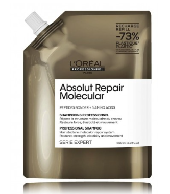 L'Oréal Professionnel Série Expert Absolut Repair Molecular Шампунь 500 ml - профессиональный восстанавливающий шампунь, который глубоко ремонтирует повреждённые волосы на молекулярном уровне. Обогащён пептидами и аминокислотами, помогает восстановить внутреннюю структуру волос, возвращая им силу, эластичность и блеск. Мягкая формула без сульфатов эффективно очищает, делая волосы мягкими, гладкими и послушными.