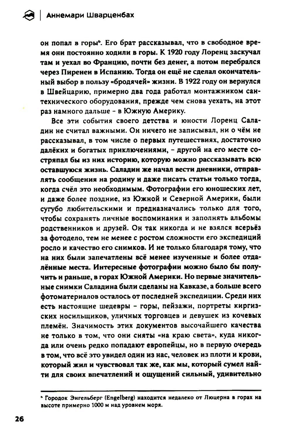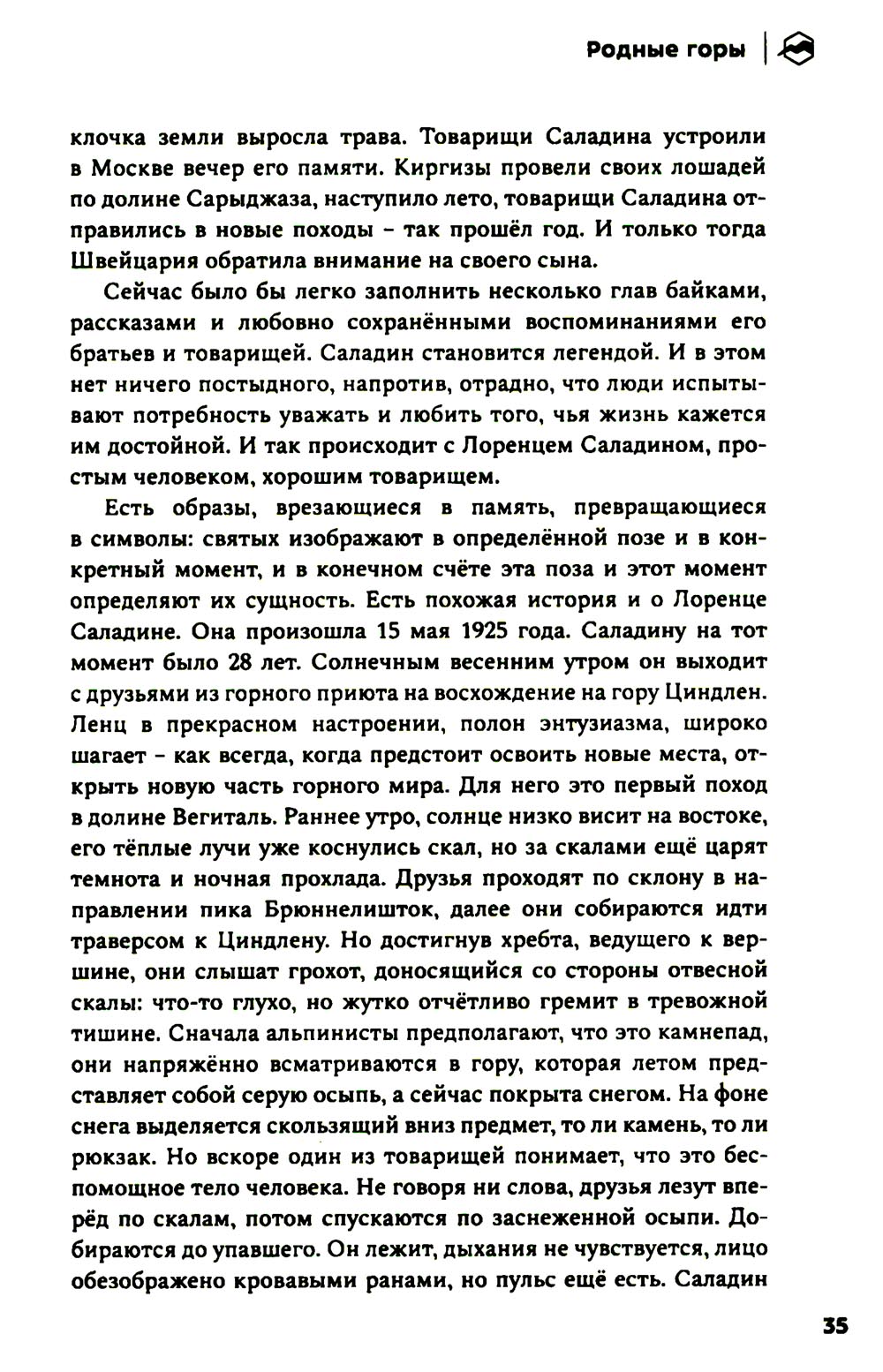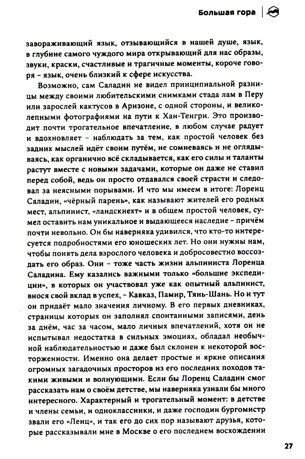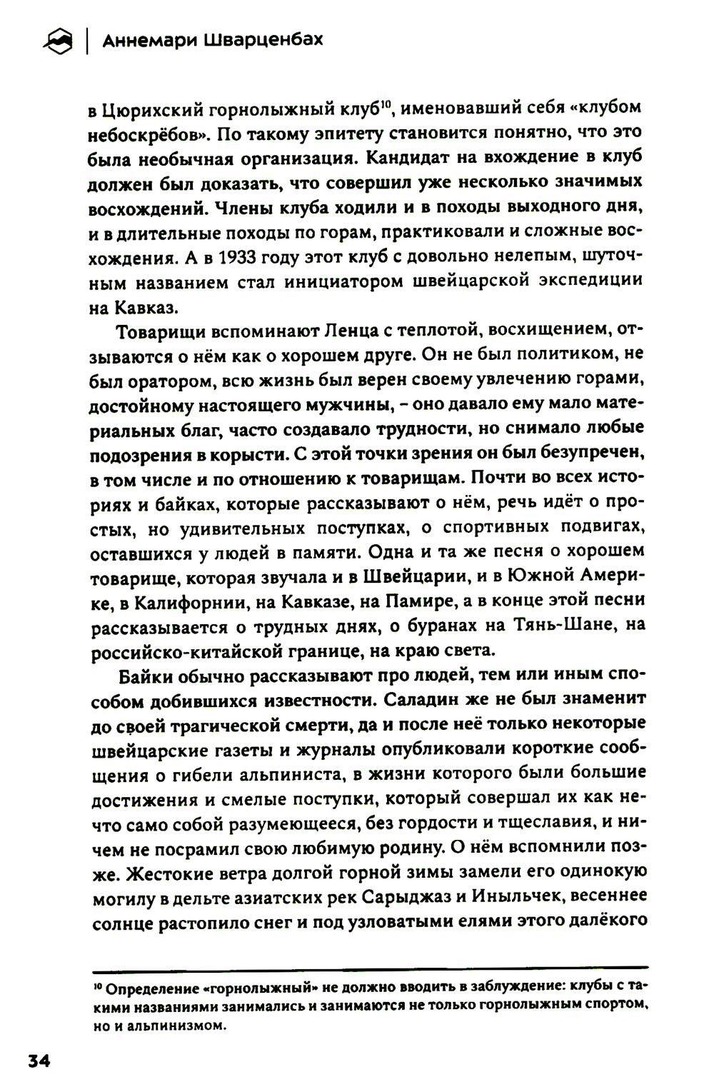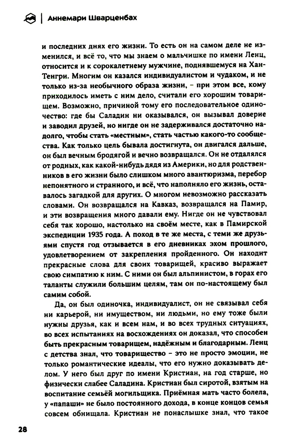 Эта книга - биография фотографа, альпиниста и искателя приключений. Саладина с юных лет манили горы. После службы в армии в Первую мировую войну он успел побывать в США и Южной Америке и принял участие в успешных экспедициях на Кавказ, Памир и Тянь-Шань в Кыргызстане. К сожалению, восхождение на Хан-Тенгри в составе советской экспедиции 1936 года закончилось для него обморожениями и смертью. Его соотечественница Аннемари Шварценбах описывает жизнь и экспедиции Саладина с большим знанием дела, эмпатией и восхищением его мужеством и предприимчивостью. Биографию дополняют многочисленные фотографии Лоренца Саладина, а также эссе Роберта Штайнера и Эмиля Цопфи.| Издательство | Библиотека Спорт-Марафон |