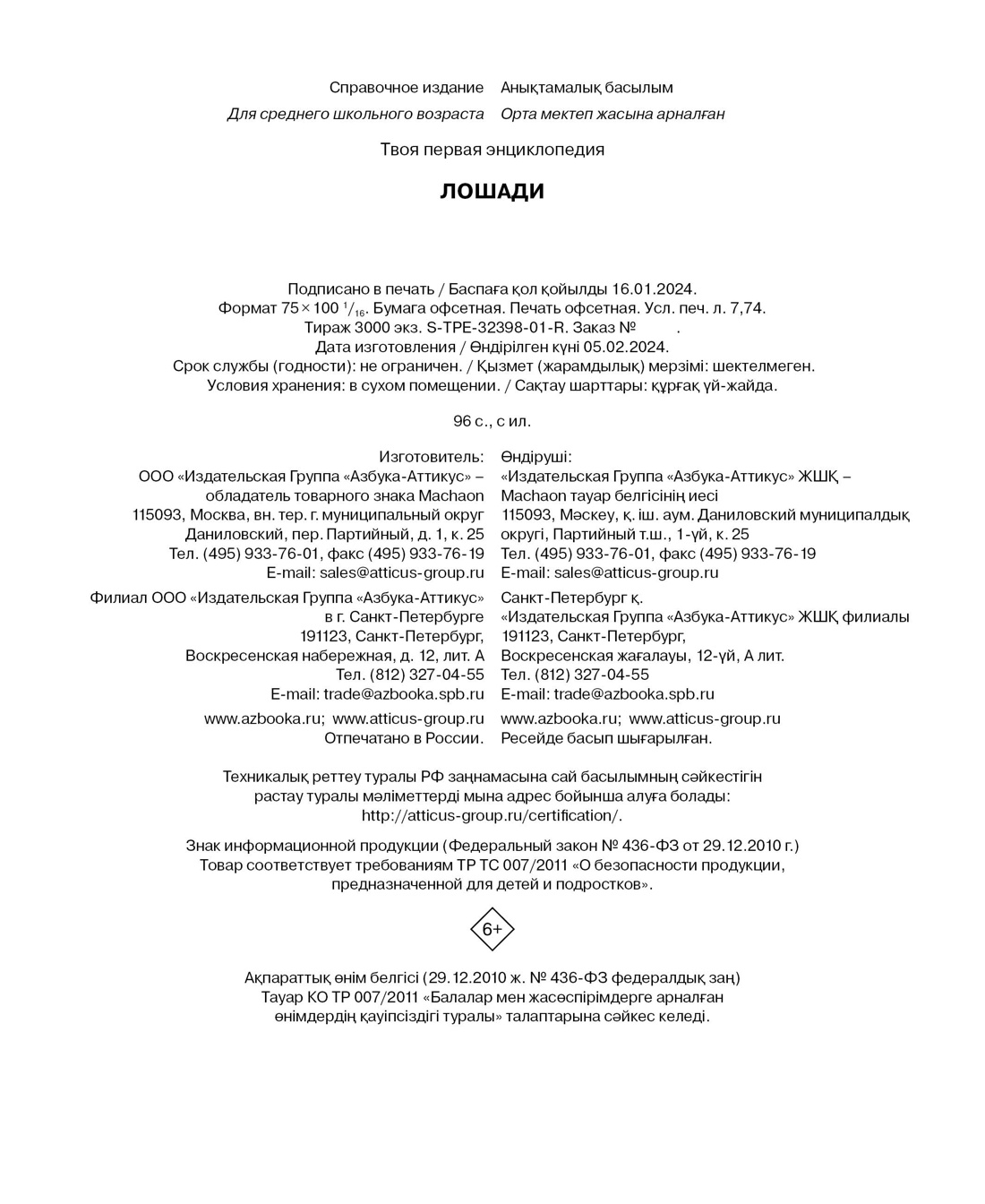 Эта книга - проводник в удивительный мир лошадей. Юные читатели побывают на конном заводе и в пони-клубе, узнают, как тренируются маленькие и взрослые всадники и как нужно заботиться о животных, посетят различные конные соревнования, а также познакомятся с историей диких и домашних лошадей и увидят, как эти прекрасные животные служат человеку. В книгах серии - только самая актуальная информация и самые современные иллюстрации! И это ещё не всё: в конце каждой книжки собраны увлекательные задания и игры, которые помогут весело провести время и повторить изученное.| Издательство | Азбука-Аттикус Издат.группа ООО |