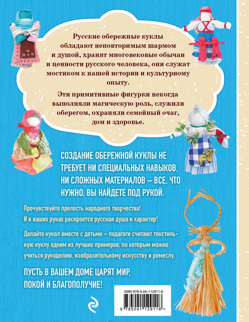 Русские обережные куклы обладают неповторимым шармом и душой! В их облике, костюмах, украшениях и даже фигуре кроются многовековые обычаи, ценности русского человека, они служат мостиком к нашему прошлому, средством приобщения к культурному опыту. Эти примитивные фигурки некогда выполняли магическую роль, служили оберегом, были важной частью любого события человеческой жизни: рождения, свадьбы и ухода из земной жизни. Они сопровождали человека на всем его жизненном пути, охраняли семейный очаг, быт и здоровье. Создание обережной куклы не требует ни специальных навыков, ни сложных материалов - все, что нужно, вы найдете под рукой. Погрузитесь в процесс, получайте удовольствие и прочувствуйте прелесть народного творчества! В ваших руках оживет не только куколка, но и историческое прошлое народов России, вы увидите как раскроются русская душа и характер! Делайте их вместе с детьми - педагоги считают текстильную куклу одним из лучших образцов, по которым можно учиться рукоделию, изобразительному искусству и ремеслу, а также познакомиться с истоками своей культуры. Пошаговые описания с яркими иллюстрациями помогут легко освоить мастерство создания обережных кукол и расскажут многое о традициях наших предков!