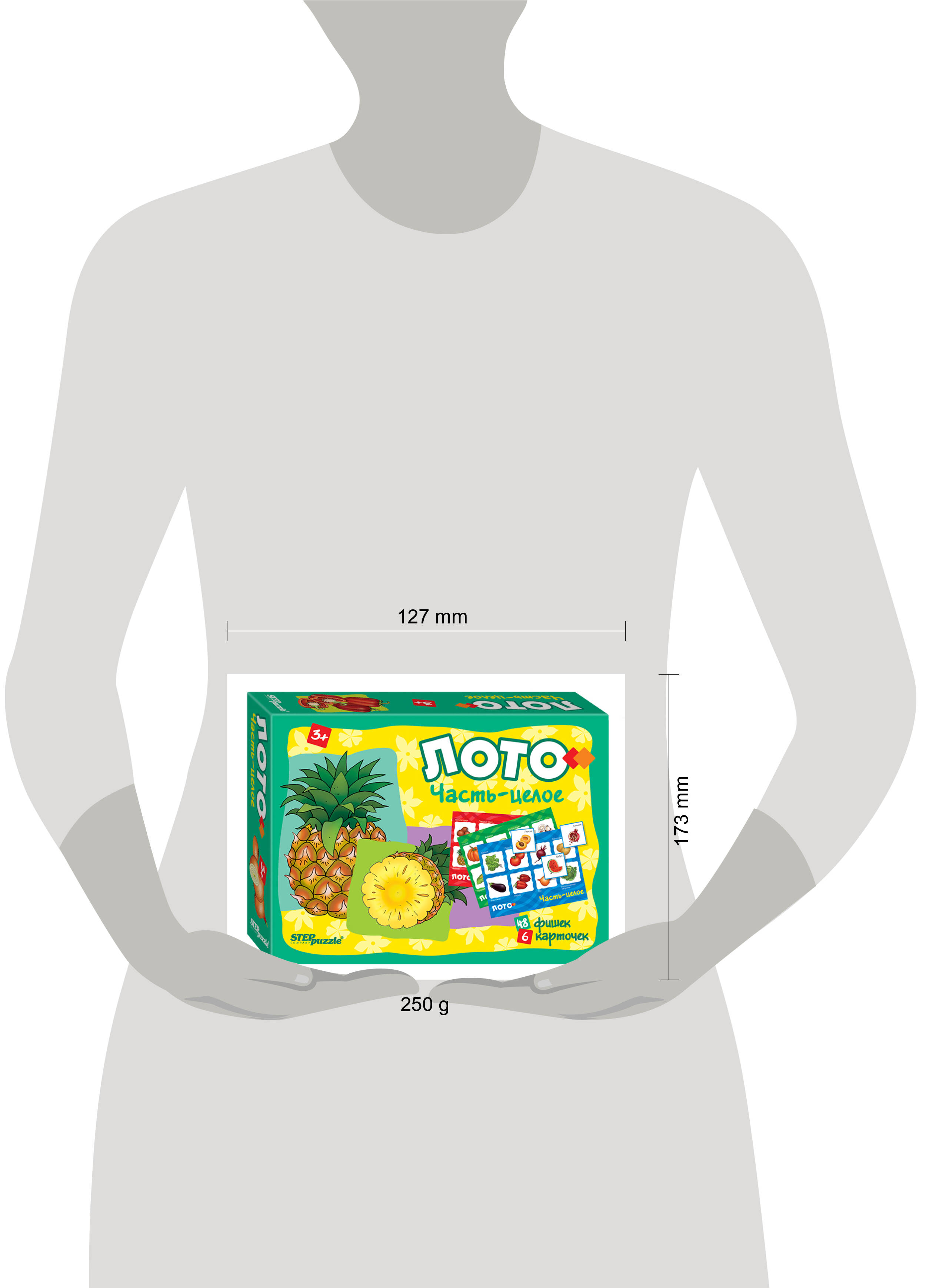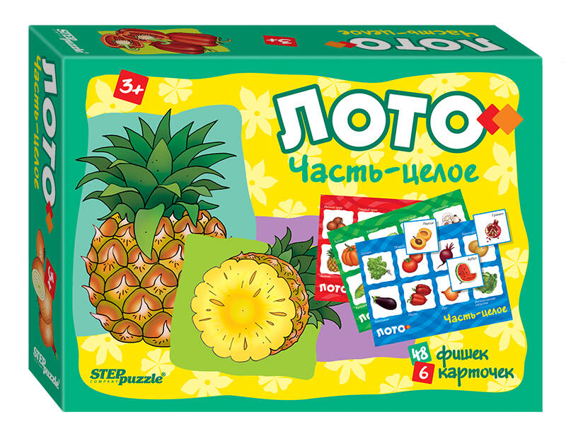 Лото "Часть-целое" знакомит с овощами, фруктами и ягодами. Учит находить целый предмет по его частям. Что полезного в игре? Игра позволяет моделировать различные игровые ситуации. В процессе игры развивается логическое мышление, наблюдательность, внимание, память, мелкая моторика. Состав игры: карточки (6 шт.) фишки (48 шт.) мешок (1 шт.) правила игры. Количество игроков. В игре может принимать участие от 2 до 6 участников. Возраст игроков. Игра подходит для детей от 3 лет. В эту серию входят: Лото "Растения-животные" Лото "Ассоциации" Лото "Буквы-цифры" Лото "Чей малыш?"| Издательство | Степ Пазл ЗАО |