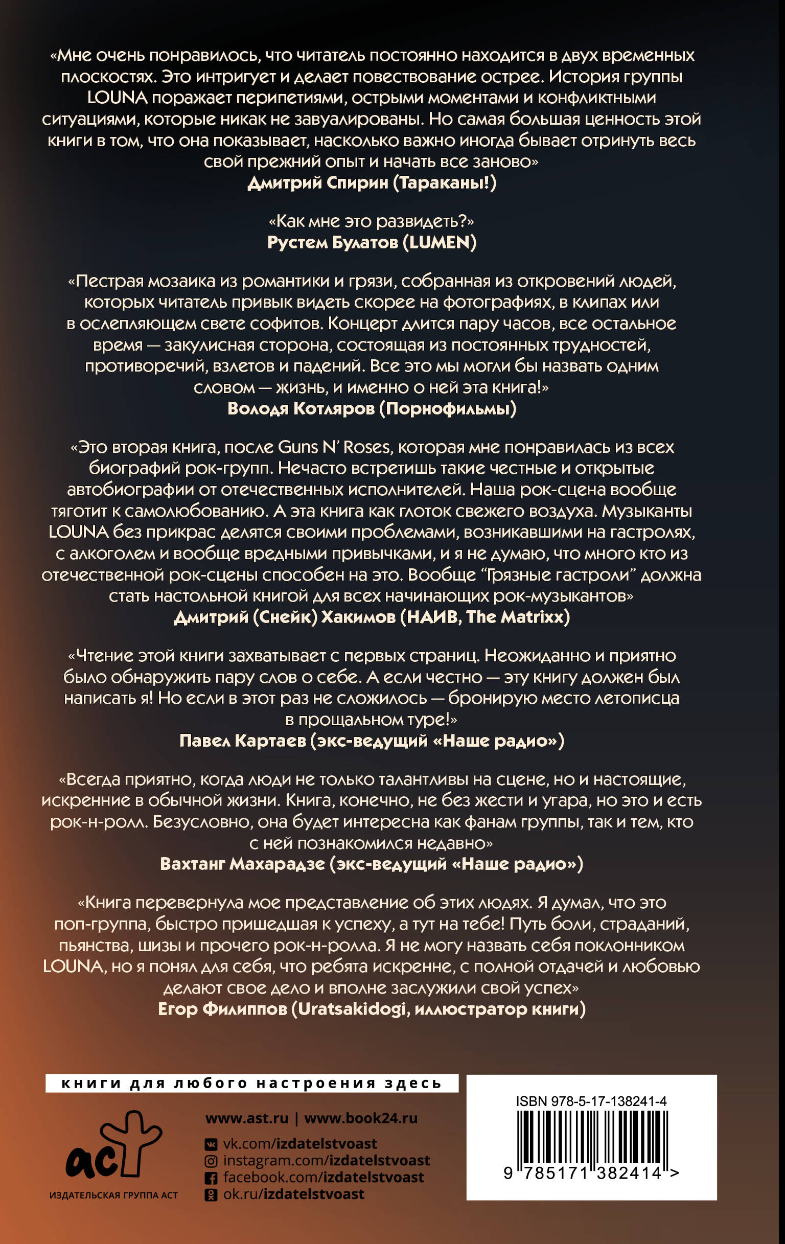 LOUNA - российская рок-группа, дебютное выступление которой состоялось 23 мая 2009 года в московском клубе "Точка", и с этого момента началась их история. Книга была подготовлена к юбилею группы благодаря мощной поддержке поклонников LOUNA и монументальному труду Владимира Ерковича, который проехал с музыкантами гастрольный тур и записал их десятилетнюю историю. "Грязные гастроли" поражает невероятным откровением и честностью ее участников. Они без прикрас делятся своими проблемами, рассказывают о конфликтах и событиях, повлиявших на их судьбы. Книга будет интересна как фанатам группы, так и тем, кому любопытна российская рок-сцена и ее закулисье.| Издательство | ИЗДАТЕЛЬСТВО "АСТ" |