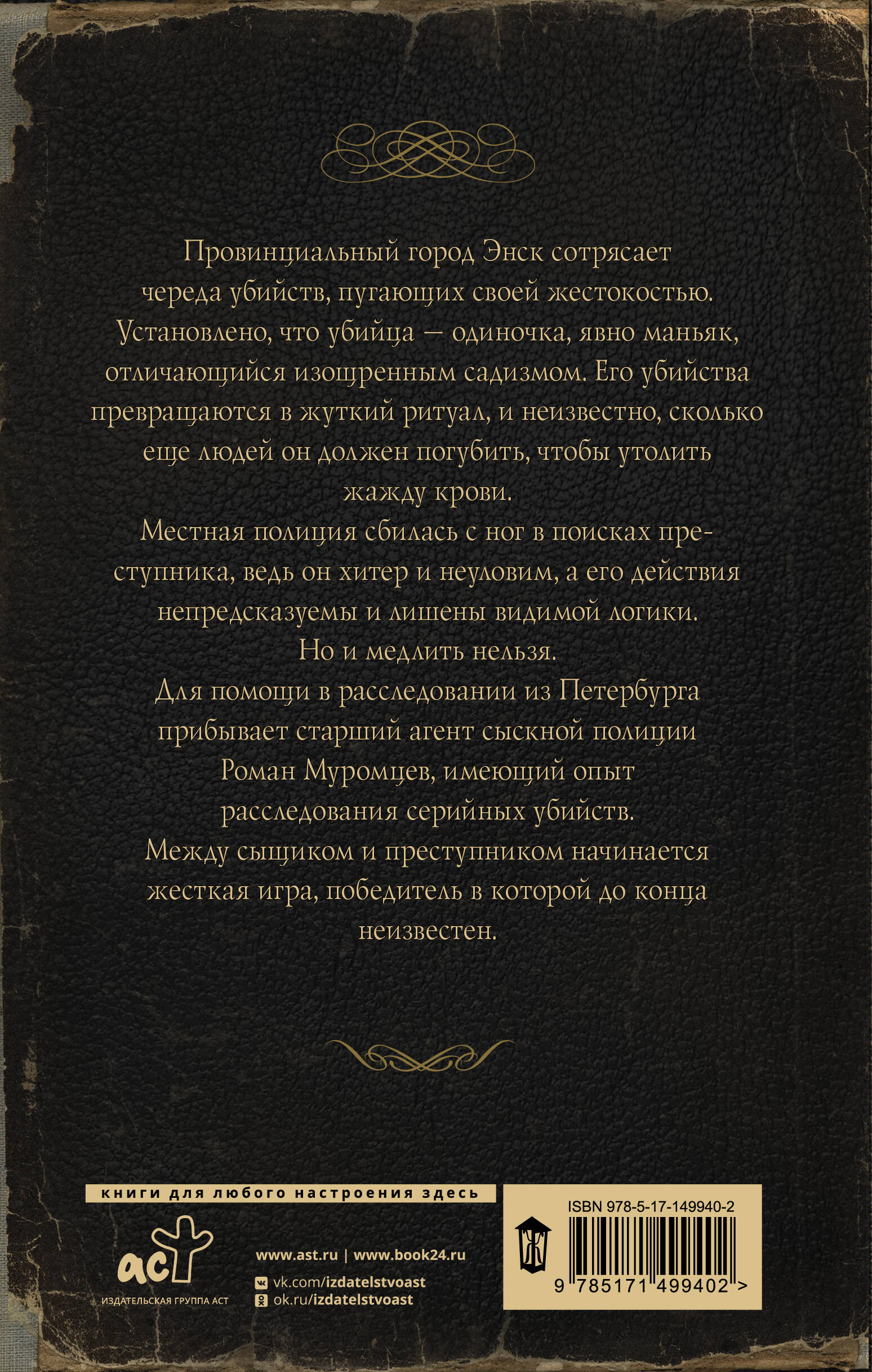 Провинциальный город Энск сотрясает череда убийств, пугающих своей жестокостью. Установлено, что убийца - одиночка, явно маньяк, отличающийся изощренным садизмом. Его убийства превращаются в жуткий ритуал, и неизвестно, сколько еще людей он должен погубить, чтобы утолить жажду крови. Местная полиция сбилась с ног в поисках преступника, ведь он хитер и неуловим, а его действия непредсказуемы и лишены видимой логики. Но и медлить нельзя. Для помощи в расследовании из Петербурга прибывает старший агент сыскной полиции Роман Муромцев, имеющий опыт расследования серийных убийств. Между сыщиком и преступником начинается жесткая игра, победитель в которой до конца неизвестен.| Издательство | ИЗДАТЕЛЬСТВО "АСТ" |