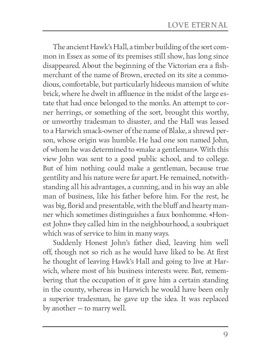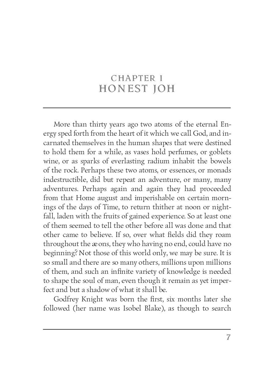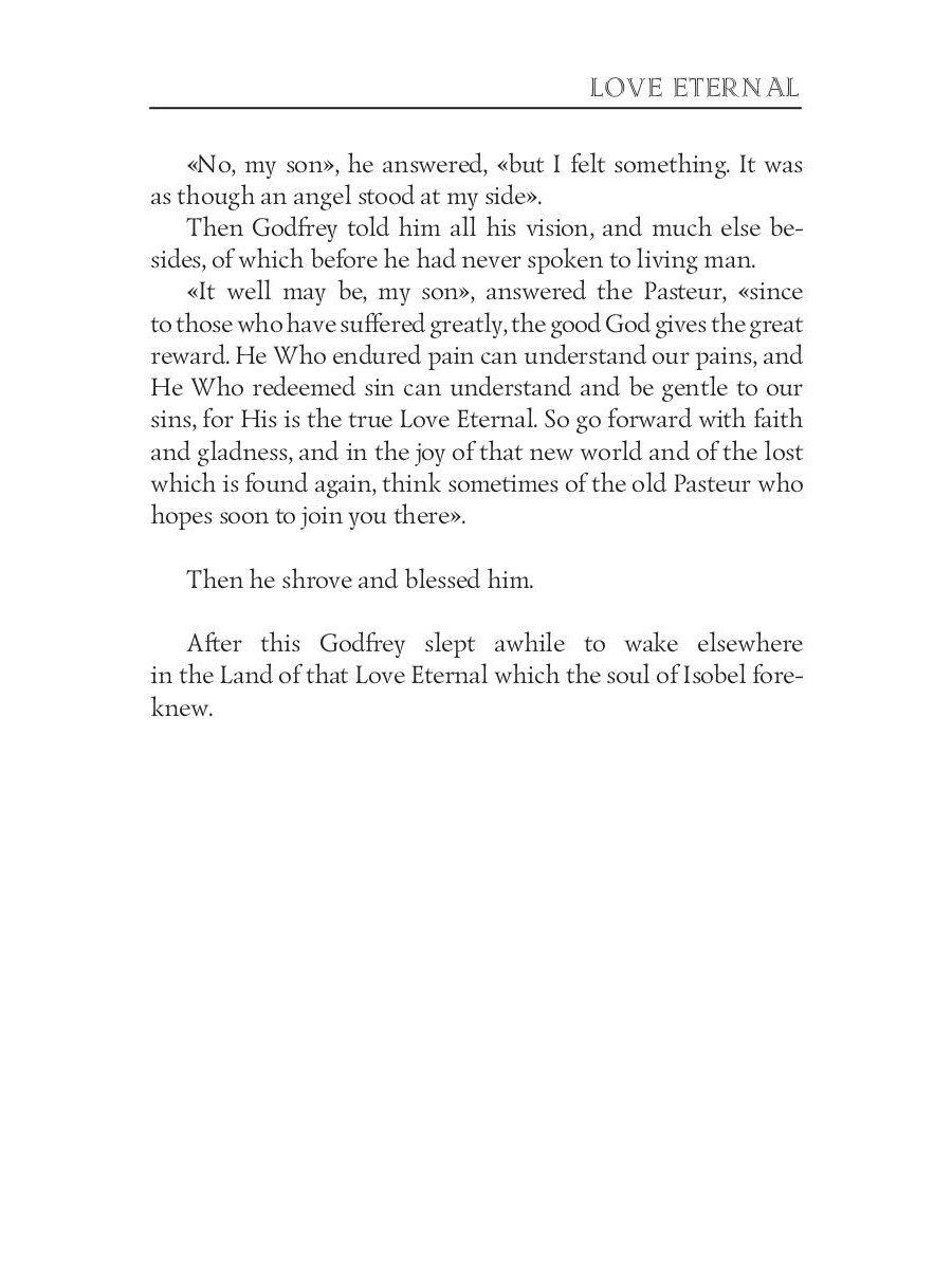 The young Godfrey Knight, the son of a puritanical parson, who lives in the Essex countryside. From childhood on, he and his neighbor, Isobel Blake, the daughter of a wealthy, boorish shipping magnate, have been strangely drawn to one another, although their natures are wholly dissimilar. Whereas Godfrey is a dreamer, Isobel is a hardheaded materialist. Despite their fathers' many attempts to keep them apart, the two do unite in matrimony, but unfortunately, their earthly happiness is a short-lived one. But, as the author makes abundantly clear, their reunion in the realm of the afterlife will surely be a glorious one...