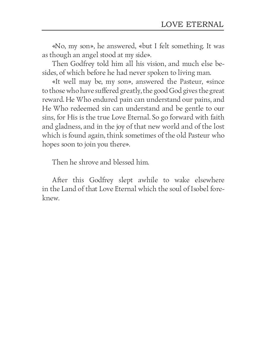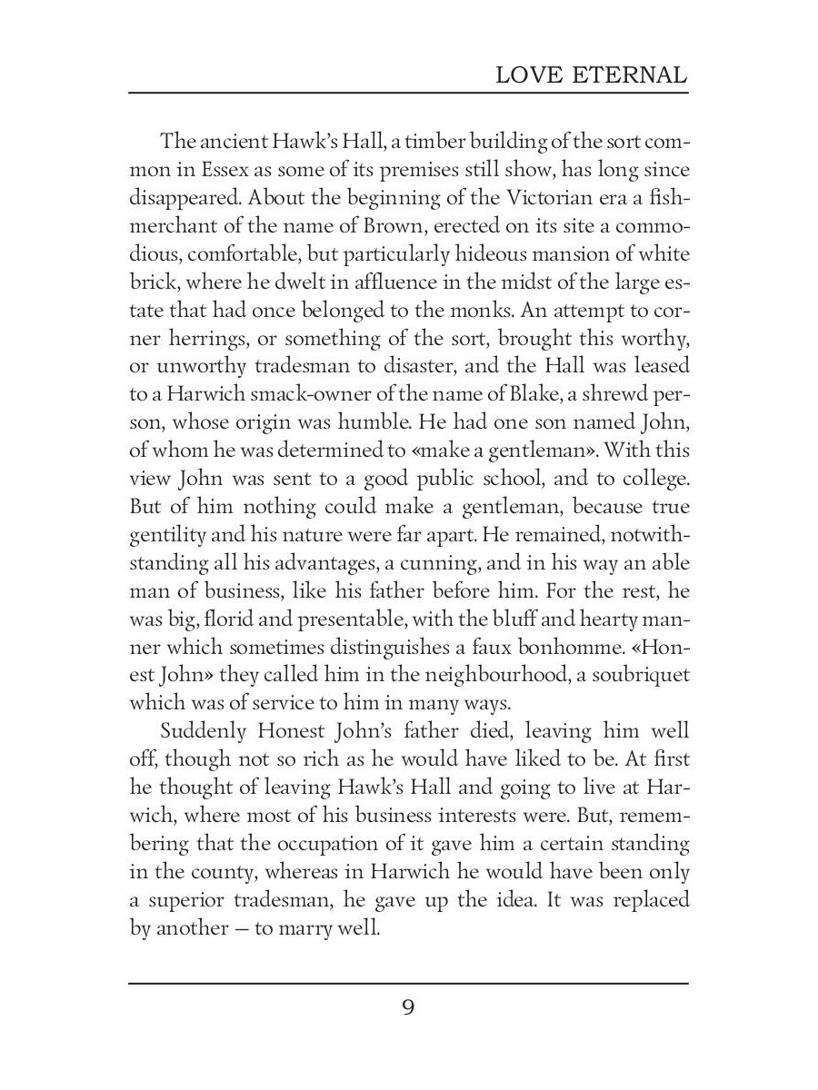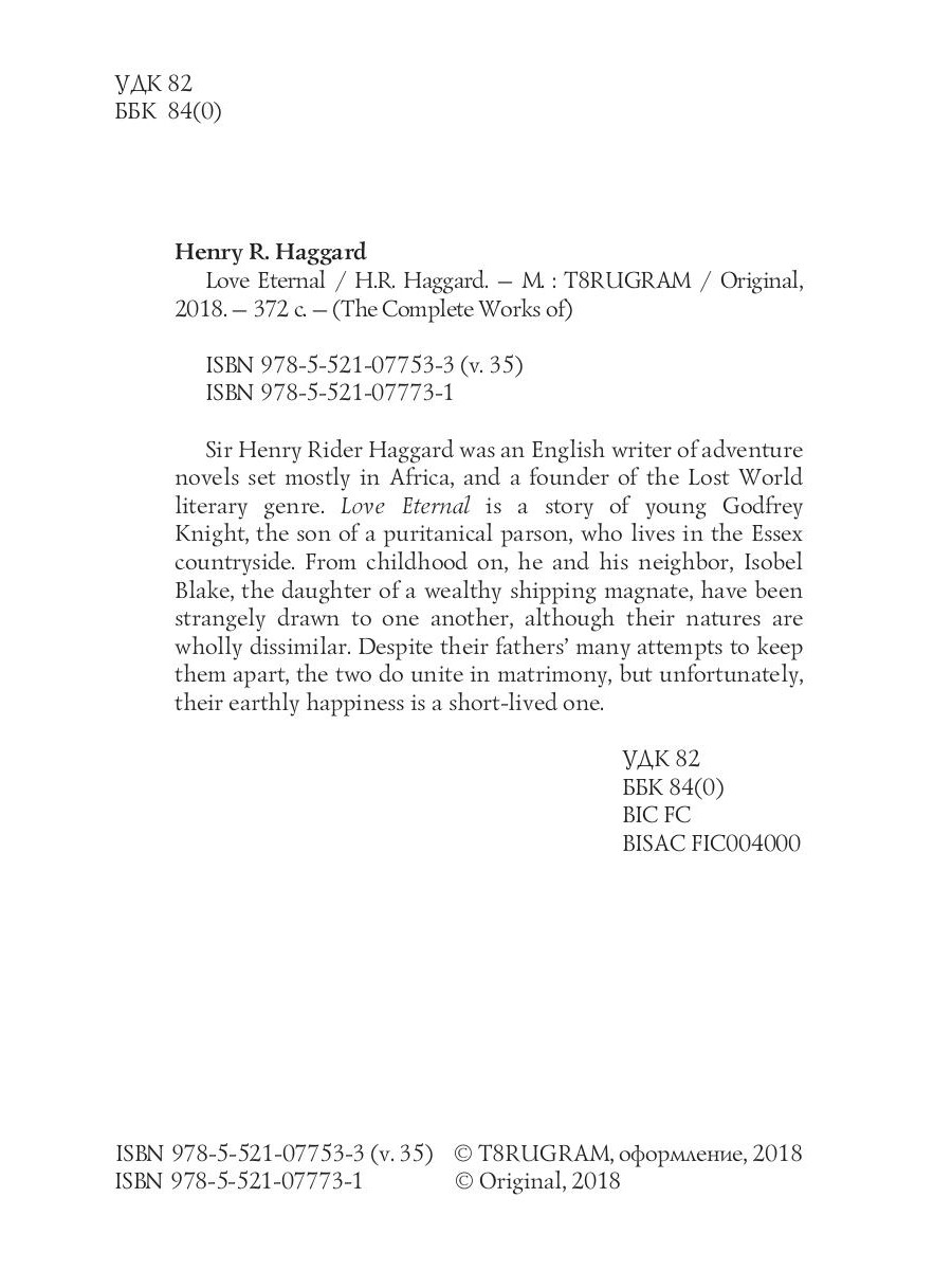 Sir Henry Rider Haggard was an English writer of adventure novels set mostly in Africa, and a founder of the Lost World literary genre. Love Eternal is a story of young Godfrey Knight, the son of a puritanical parson, who lives in the Essex countryside. From childhood on, he and his neighbor, Isobel Blake, the daughter of a wealthy shipping magnate, have been strangely drawn to one another, although their natures are wholly dissimilar. Despite their fathers' many attempts to keep them apart, the two do unite in matrimony, but unfortunately, their earthly happiness is a short-lived one.| Издательство | Т8 RUGRAM |