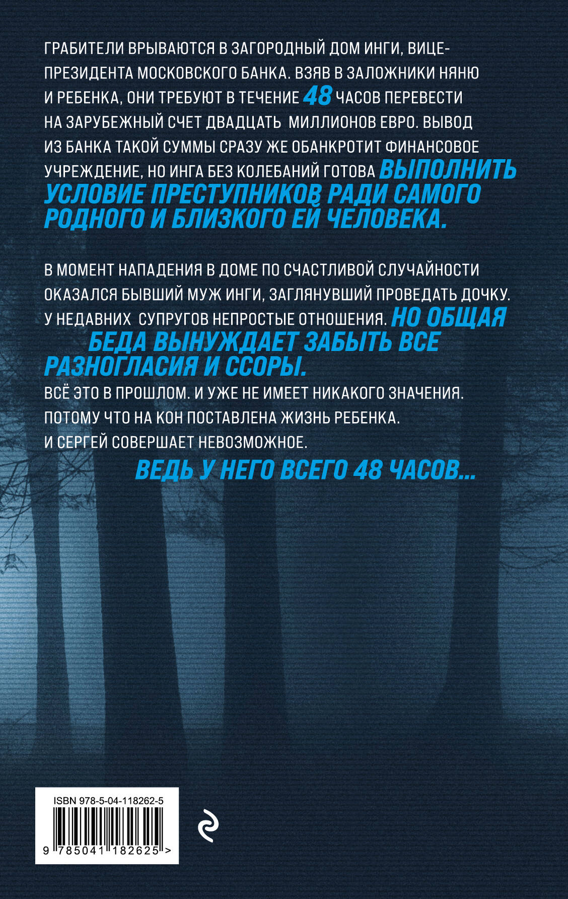 Криминальный триллер со стремительным развитием сюжета и головокружительными поворотами в духе лучших романов Дж. Х. Чейза. Грабители врываются в загородный дом Инги, вице-президента московского банка. Взяв в заложники няню и ребенка, они требуют в течение 48 часов перевести на зарубежный счет двадцать миллионов евро. Вывод из банка такой суммы сразу же обанкротит финансовое учреждение, но Инга без колебаний готова выполнить условие преступников ради самого родного и близкого ей человека. В момент нападения в доме по счастливой случайности оказался бывший муж Инги, заглянувший проведать дочку. У недавних супругов непростые отношения. Но общая беда вынуждает забыть все разногласия и ссоры. Всё это в прошлом. И уже не имеет никакого значения. Потому что на кон поставлена жизнь ребенка. И Сергей совершает невозможное…| Издательство | ООО "Издательство "Эксмо" |