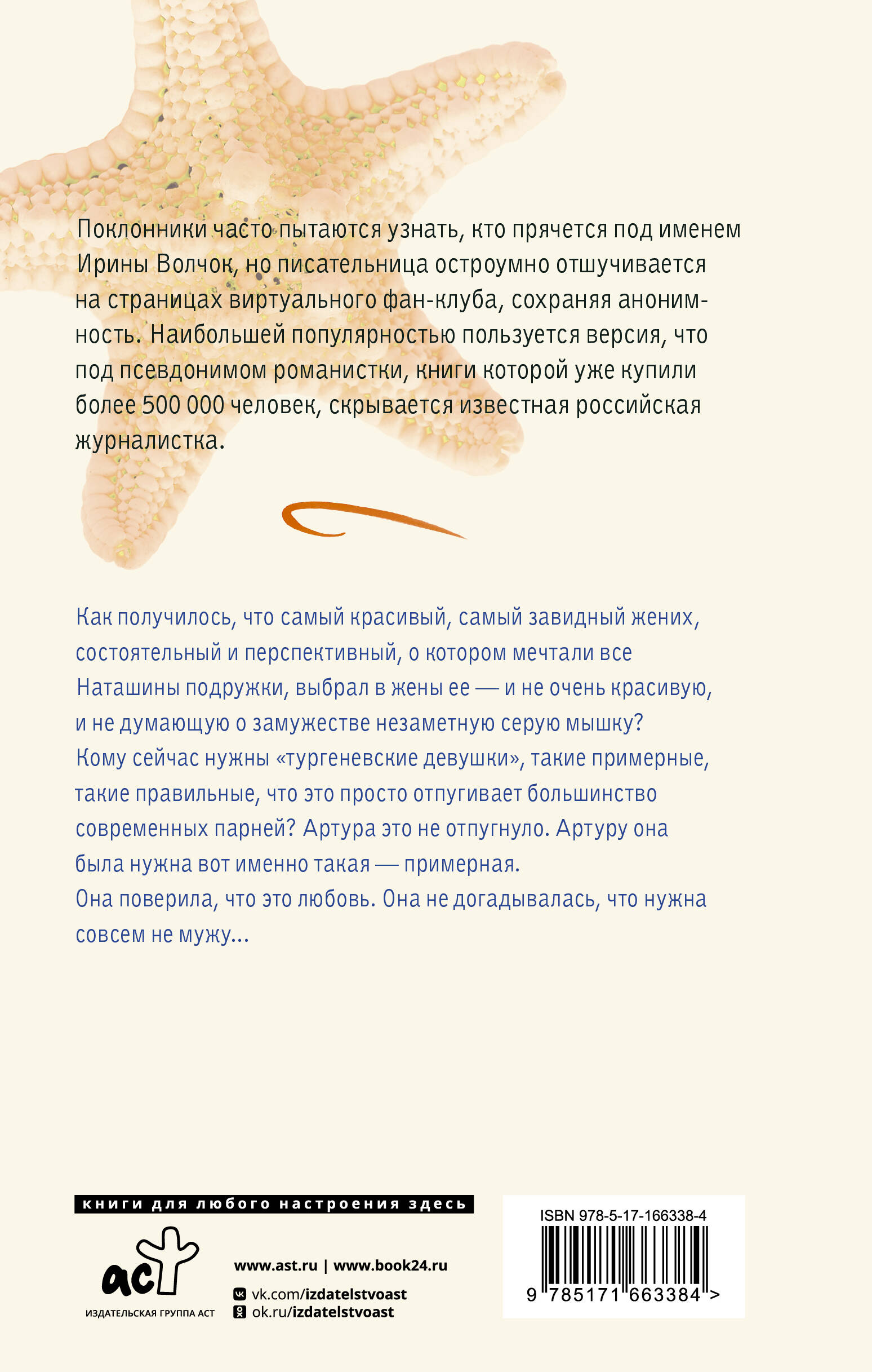 - От популярного автора любовной прозы. - Роман о том, как преломляется любовь в наших сердцах, о том, что для женщин она - история, а для мужчин - лишь эпизод. - Романы Ирины Волчок отличают живой слог, отличный литературный язык и неизменное позитивное послевкусие. Книги писательницы уже купили более 500 000 человек. - Поклонники часто пытаются узнать, кто же прячется под именем Ирины Волчок, но автор остроумно отшучивается. Наибольшей популярностью пользуется версия, что под псевдонимом романистки скрывается известная российская журналистка. - Авторская серия «Главный приз. Романы о любви».| Издательство | Издательство "АСТ" |