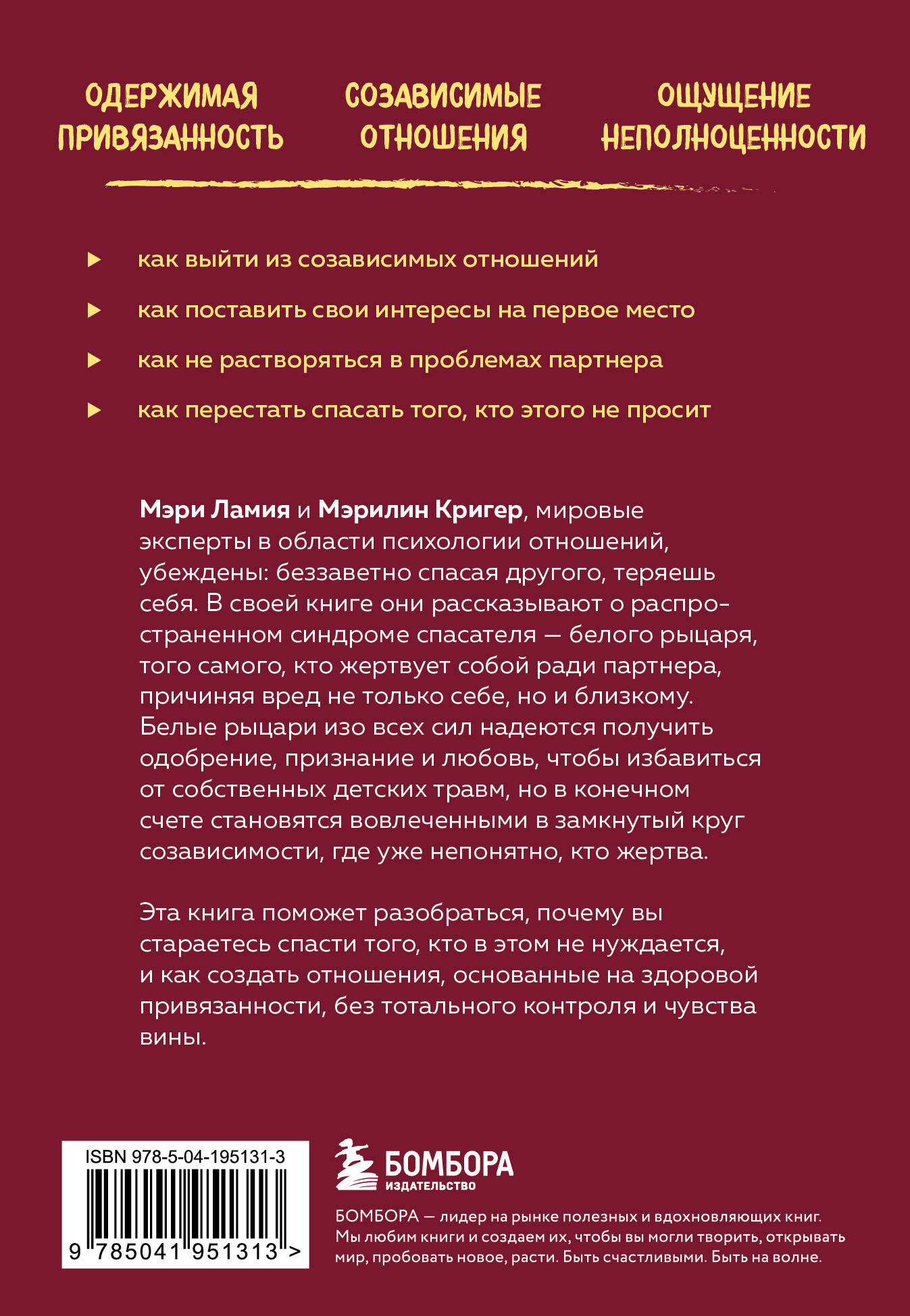 ВНУТРИ ТЕСТ ДЛЯ САМОДИАГНОСТИКИ: ЕСТЬ ЛИ У ВАС СИНДРОМ БЕЛОГО РЫЦАРЯ? Мэри Ламия и Мэрилин Кригер, мировые эксперты в области психологии отношений, убеждены: беззаветно спасая другого - теряешь себя. В своей книге они рассказывают о распространенном синдроме спасателя - белого рыцаря, того самого, кто жертвует собой ради партнера, причиняя вред не только себе, но и близкому. Белые рыцари изо всех сил надеются получить одобрение, признание и любовь, чтобы избавиться от собственных детских травм, но в конечном счете становятся вовлеченными в замкнутый круг созависимости, где уже непонятно, кто жертва. Эта книга поможет разобраться, почему вы стараетесь спасти того, кто в этом не нуждается, и как создать отношения, основанные на здоровой привязанности, без тотального контроля и чувства вины. Из этой книги вы узнаете, как: - выйти из созависимых отношений; - поставить свои интересы на первое место; - не растворяться в проблемах партнера; - перестать спасать того, кто этого не просит.| Издательство | ООО "Издательство "Эксмо" |