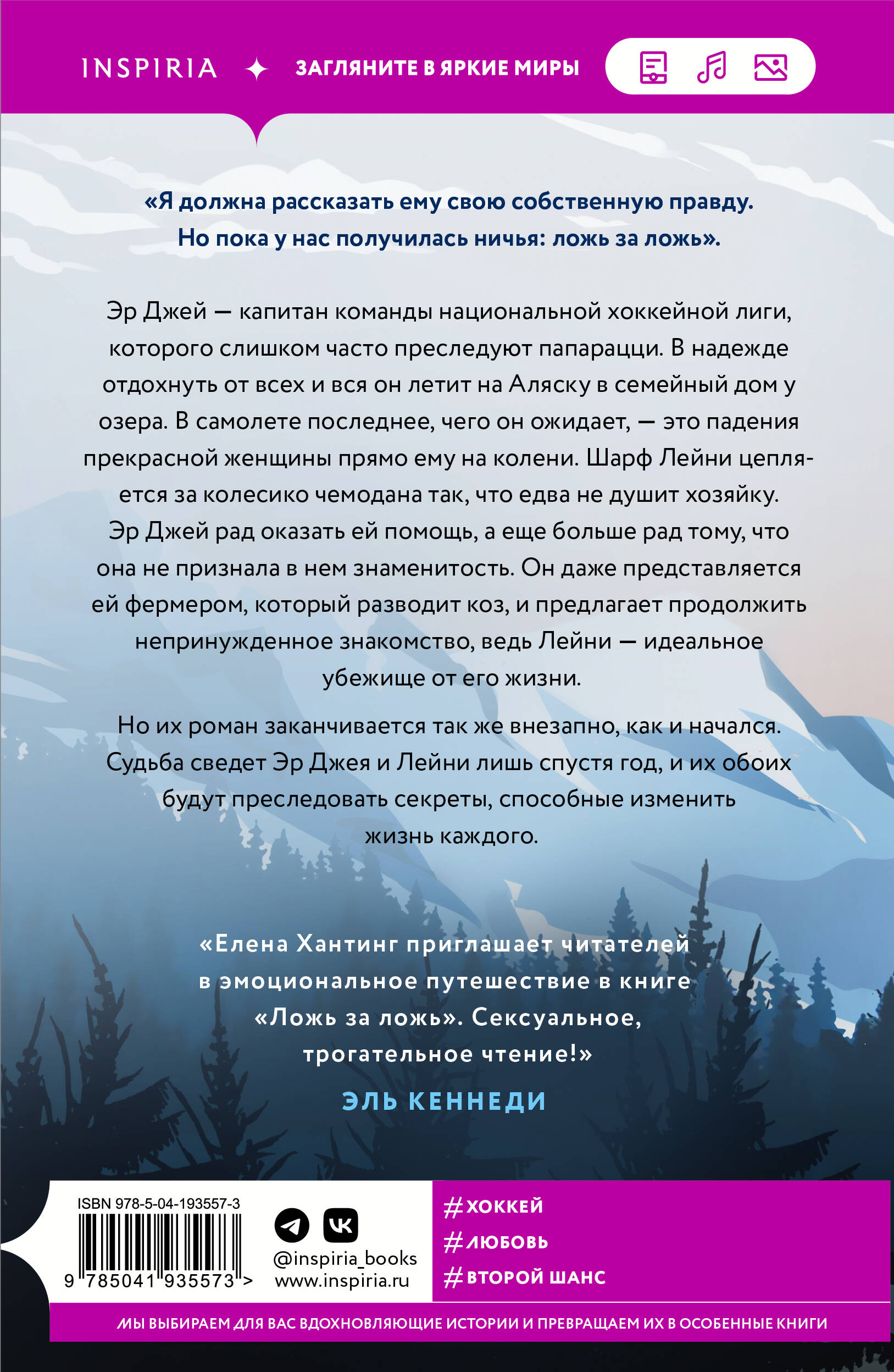 «Я должна рассказать ему свою собственную правду. Но пока у нас получилась ничья: ложь за ложь». Эр Джей - капитан команды национальной хоккейной лиги, которого слишком часто преследуют папарацци. В надежде отдохнуть от всех и вся он летит на Аляску в семейный дом у озера. В самолете последнее, чего он ожидает - это падения прекрасной женщины прямо ему на колени. Шарф Лейни цепляется за колесико чемодана так, что едва не душит хозяйку. Эр Джей рад оказать ей помощь, а еще больше рад тому, что она не признала в нем знаменитость. Он даже представляется ей фермером, который разводит коз, и предлагает продолжить непринужденное знакомство, ведь Лейни - идеальное убежище от его жизни. Но их роман заканчивается так же внезапно, как и начался. Судьба сведет Эр Джея и Лейни лишь спустя год, и их обоих будут преследовать секреты, способные изменить жизнь каждого. «Елена Хантинг приглашает читателей в эмоциональное путешествие в книге "Ложь за ложь". Сексуальное, трогательное чтение!» - Эль Кеннеди «Этот прекрасный роман - истинное совершенство. Эр Джей - идеальный книжный бойфренд. Мне понравилась эта история от начала до конца». - Кендалл Райан, автор бестселлера «Холостяки» «Елена Хантинг преподносит умную, забавную, эмоциональную историю, которая захватывает читателя с первой страницы. Безумное и милое знакомство в самолете? Давайте сюда». - Ильза Мэдден-Миллз, автор бестселлера «Не мой Ромео»| Издательство | ООО "Издательство "Эксмо" |