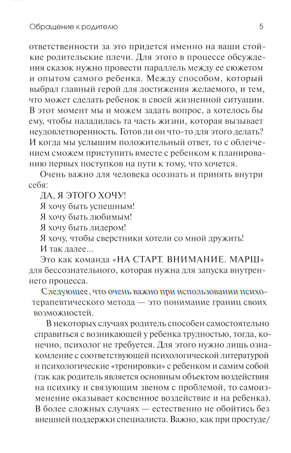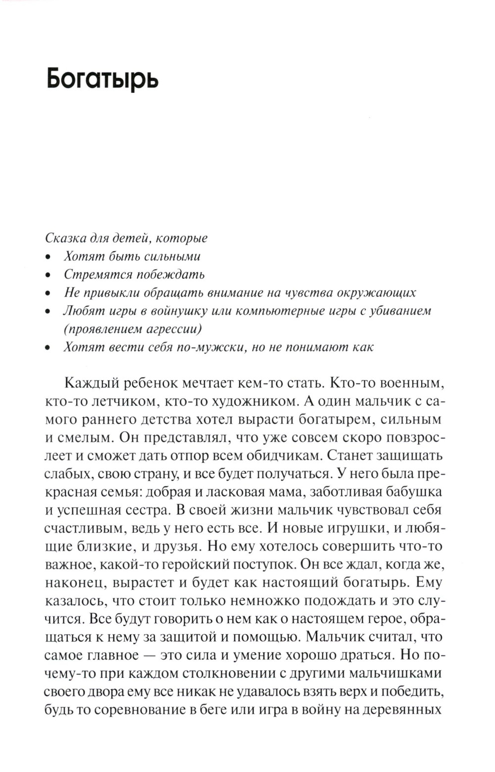 В этой книге вы найдете не просто терапевтические сказки и волшебные истории. В каждой из них заложено глубокое понимание причин появления детских проблем (будь то отношение окружающих или внутреннее состояние, вызванное возрастным кризисом). В описании жизни героев можно увидеть характерные признаки ситуации развития, присущей той или иной проблеме. Поэтому книга является подсказкой не только детям, но и взрослым, задающим себе вопрос, отчего в жизни ребенка появилась трудность или почему он ведет себя тем или иным образом. Также в каждой истории сделан упор на эмоциях и ощущениях, которые испытывают главные герои. Это помогает детям лучше сопереживать им, учиться понимать себя: чувства, реакции на слова, поведение. Важной составляющей каждой сказки является освещение и привлечение внимания к положительным переживаниям главных героев в конце. Таким образом, у детей создается положительное представление о взаимоотношениях, которые всегда можно наладить и привести к желаемому состоянию. В книге затронуты многие темы, актуальные для детского возраста: злость, ревность, страхи, обида, застенчивость, неуверенность в себе, успешность, лидерство, смелость, психосоматика, развод родителей, смерть близких, умение мечтать, женские и мужские черты характера, детская дружба, взаимопонимание, трудолюбие, самостоятельность, принятие себя и другие. Книга будет полезна психологам, учителям и воспитателям и в первую очередь - родителям.