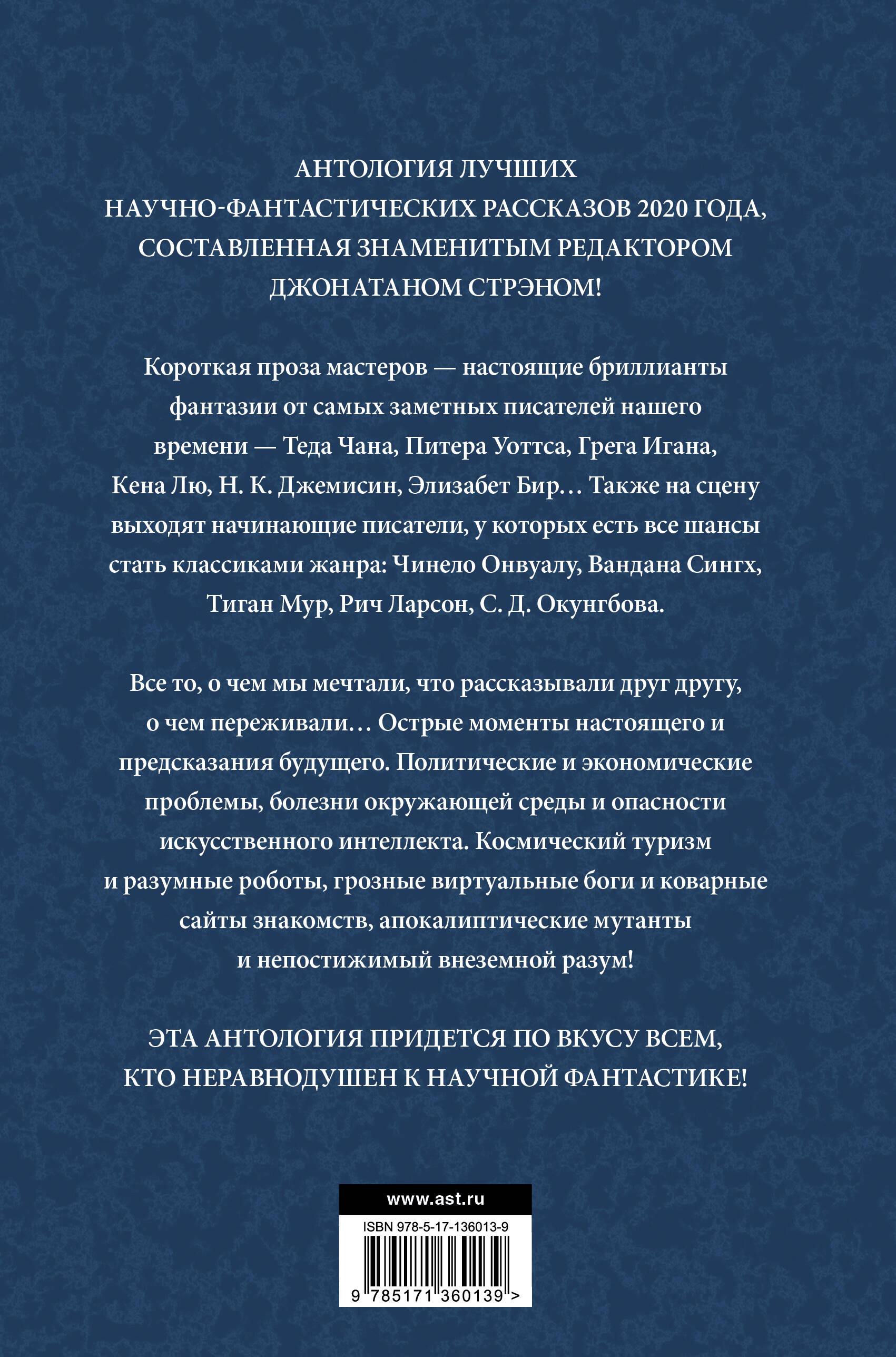 Антология лучших научно-фантастических рассказов 2020 года, составленная знаменитым редактором Джонатаном Стрэном! Короткая проза мастеров - настоящие бриллианты фантазии от самых заметных писателей нашего времени - Теда Чана, Питера Уоттса, Грега Игана, Кена Лю, Н. К. Джемисин, Элизабет Бир… Также на сцену выходят начинающие писатели, у которых есть все шансы стать классиками жанра: Чинело Онвуалу, Вандана Сингх, Тиган Мур, Рич Ларсон, С. Д. Окунгбова. Все то, о чем мы мечтали, что рассказывали друг другу, о чем переживали… Острые моменты настоящего и предсказания будущего. Политические и экономические проблемы, болезни окружающей среды и опасности искусственного интеллекта. Космический туризм и разумные роботы, грозные виртуальные боги и коварные сайты знакомств, апокалиптические мутанты и непостижимый внеземной разум! Эта антология придется по вкусу всем, кто неравнодушен к научной фантастике!| Издательство | ИЗДАТЕЛЬСТВО "АСТ" |