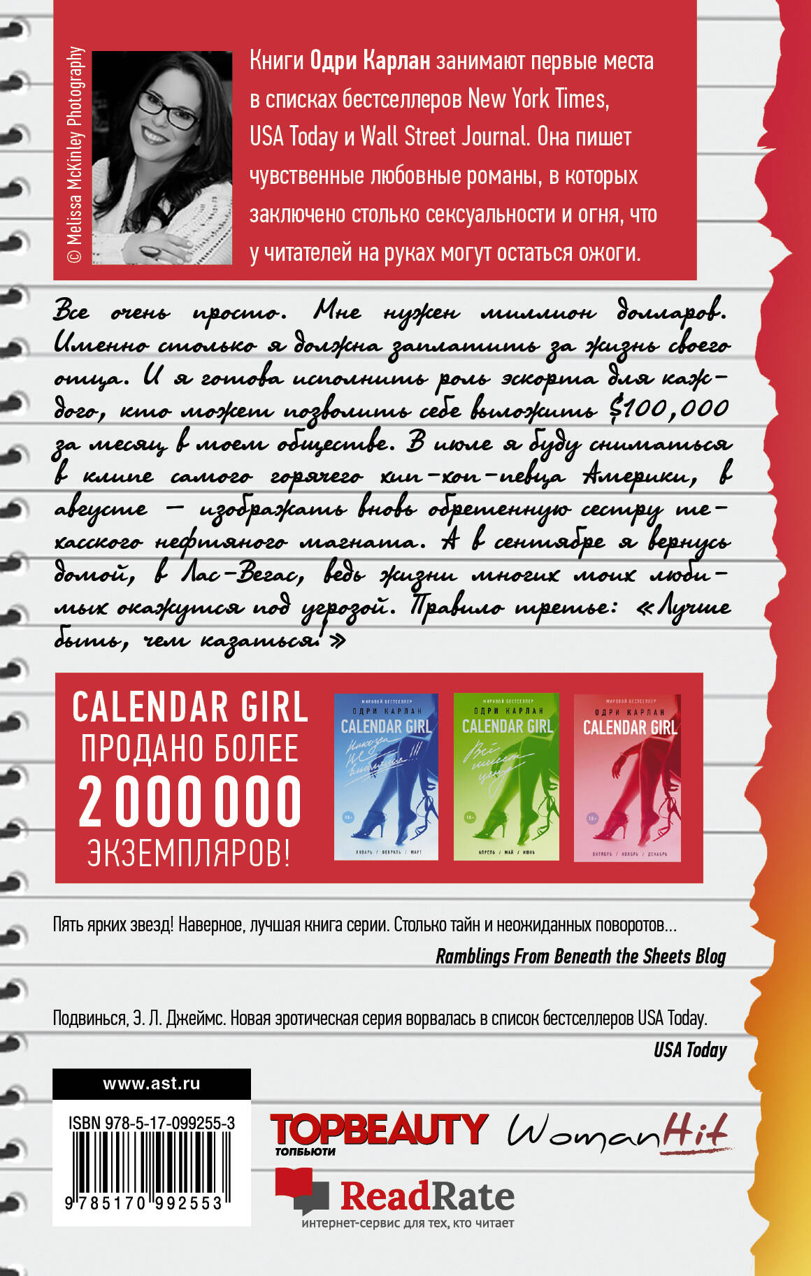 «Лучше быть, чем казаться» - третья часть романтической саги «Calendar Girl» американской писательницы Одри Карлан, чьи книги переведены более чем на тридцать языков и неоднократно становились лидерами рейтингов New York Times, USA Today и Wall Street Journal. Какие еще необыкновенные приключения могут случиться с отчаянной девчонкой Миа Сандерс, пытающейся заработать денег, чтобы оплатить космические долги своего отца? Фантазия Одри Карлан предложит новые сюжетные сюрпризы и пикантные подробности жизни своей героини! Приготовьтесь, лето будет жарким! Июль собьет с ног ритмами пуэрториканских мелодий и чувственными танцами. Август вызовет тревогу и откроет тайну, которая кардинально изменит жизнь девушки. Сентябрь охладит летние страсти, но… поставит ее перед жестоким выбором между любовью и обстоятельствами. Каждый месяц - новая история, новый город и новые искушения! Но где бы ни появилась Миа, ее всегда сопровождают тонкий флирт и испепеляющая ревность, коварный соблазн и почти животное желание. Сможет ли она в такой компании сохранить верность человеку, которому сказала заветные три слова: «Я люблю тебя…»? Отзывы «Пять ярких звезд! Наверное, лучшая книга серии. Столько тайн и неожиданных поворотов…» - Ramblings From Beneath the Sheets Blog «Подвинься, Э. Л. Джеймс. Новая эротическая серия ворвалась в список бестселлеров USA Today». - USA Today