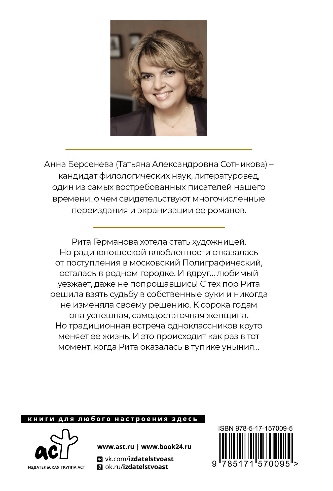 НАСТОЯЩИЙ МАТЕРИАЛ (ИНФОРМАЦИЯ) ПРОИЗВЕДЕН ИНОСТРАННЫМ АГЕНТОМ ТАТЬЯНОЙ АЛЕКСАНДРОВНОЙ СОТНИКОВОЙ, ЛИБО МАТЕРИАЛ (ИНФОРМАЦИЯ) КАСАЕТСЯ ДЕЯТЕЛЬНОСТИ ИНОСТРАННОГО АГЕНТА ТАТЬЯНЫ АЛЕКСАНДРОВНЫ СОТНИКОВОЙ. Рита Германова хотела стать художницей. Но ради юношеской влюбленности отказалась от поступления в московский Полиграфический, осталась в родном городке. И вдруг… любимый уезжает, даже не попрощавшись! С тех пор Рита решила взять судьбу в собственные руки и никогда не изменяла своему решению. К сорока годам она успешная, самодостаточная женщина. Но традиционная встреча одноклассников круто меняет ее жизнь. И это происходит как раз в тот момент, когда Рита оказалась в тупике уныния…| Издательство | ИЗДАТЕЛЬСТВО "АСТ" |