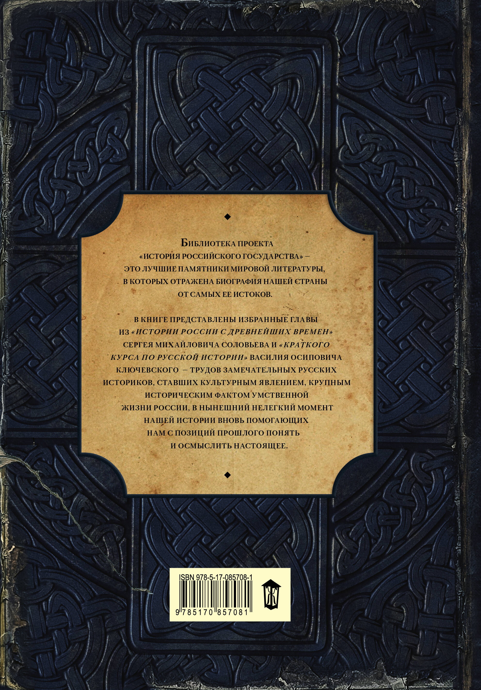 Библиотека проекта "История Российского государства" - это рекомендованные Борисом Акуниным лучшие памятники исторической литературы, в которых отражена биография нашей страны, от самых ее истоков. В книге представлены избранные главы из "Истории России с древнейших времен" Сергея Михайловича Соловьева и "Краткого курса по русской истории" Василия Осиповича Ключевского - трудов замечательных русских историков, ставших культурным явлением, крупным историческим фактом умственной жизни России, в нынешний нелегкий момент нашей истории вновь помогающих нам с позиций прошлого понять и осмыслить настоящее.| Издательство | ИЗДАТЕЛЬСТВО "АСТ" |
