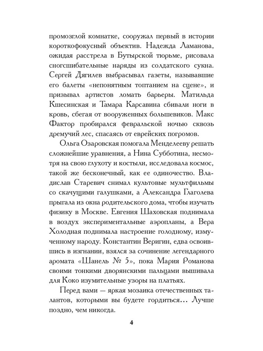 Перелом веков! Революции идут одна за другой, как волны при сильном шторме: промышленная, культурная, научная. На гребне каждой волны удивительные таланты. Но, едва успев заявить о себе, эти таланты вдребезги разбиваются о бюрократические скалы консервативной Российской империи. Герои этой книги - астрономы и балерины, антрепренеры и физики-теоретики, фотографы и модельеры, летчицы и гримеры. К то-то из них прославился на весь мир, кто-то всю жизнь прозябал в безвестности. Но всех объединяет главное: поразительная сила характера и выдающиеся способности, не нашедшие применения на родине, но пригодившиеся за границей... При подготовке сборника использовались материалы, никогда ранее не переводившиеся на русский язык. Биографии представлены в хронологической последовательности. Напряжение в книге возрастает по мере приближения революции 1917 года.| Издательство | Омега-Л |